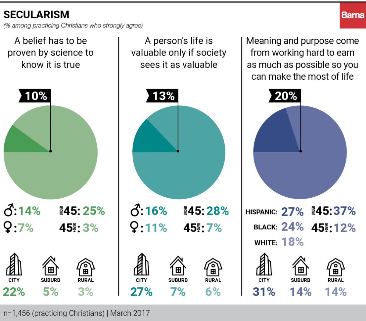While most “practicing Christians resist scientism and a Darwinian belief … a larger contingent of practicing Christians are more inclined toward materialism,” Barna stated. The report found that 1 in 5 practicing Christians believe that “meaning and purpose comes from working hard to earn as much as possible so you can make the most of life.”