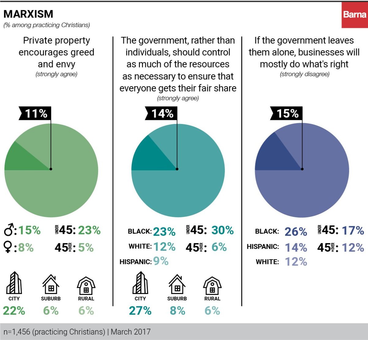 While very few practicing Christians would support communist (0%) and socialist (3%) political candidates, 1 in 10 practicing Christians strongly agree that “private property encourages greed and envy.” Barna also found that 15 percent of practicing Christians strongly disagree that “if the government leaves businesses alone, they will mostly do what’s right.”