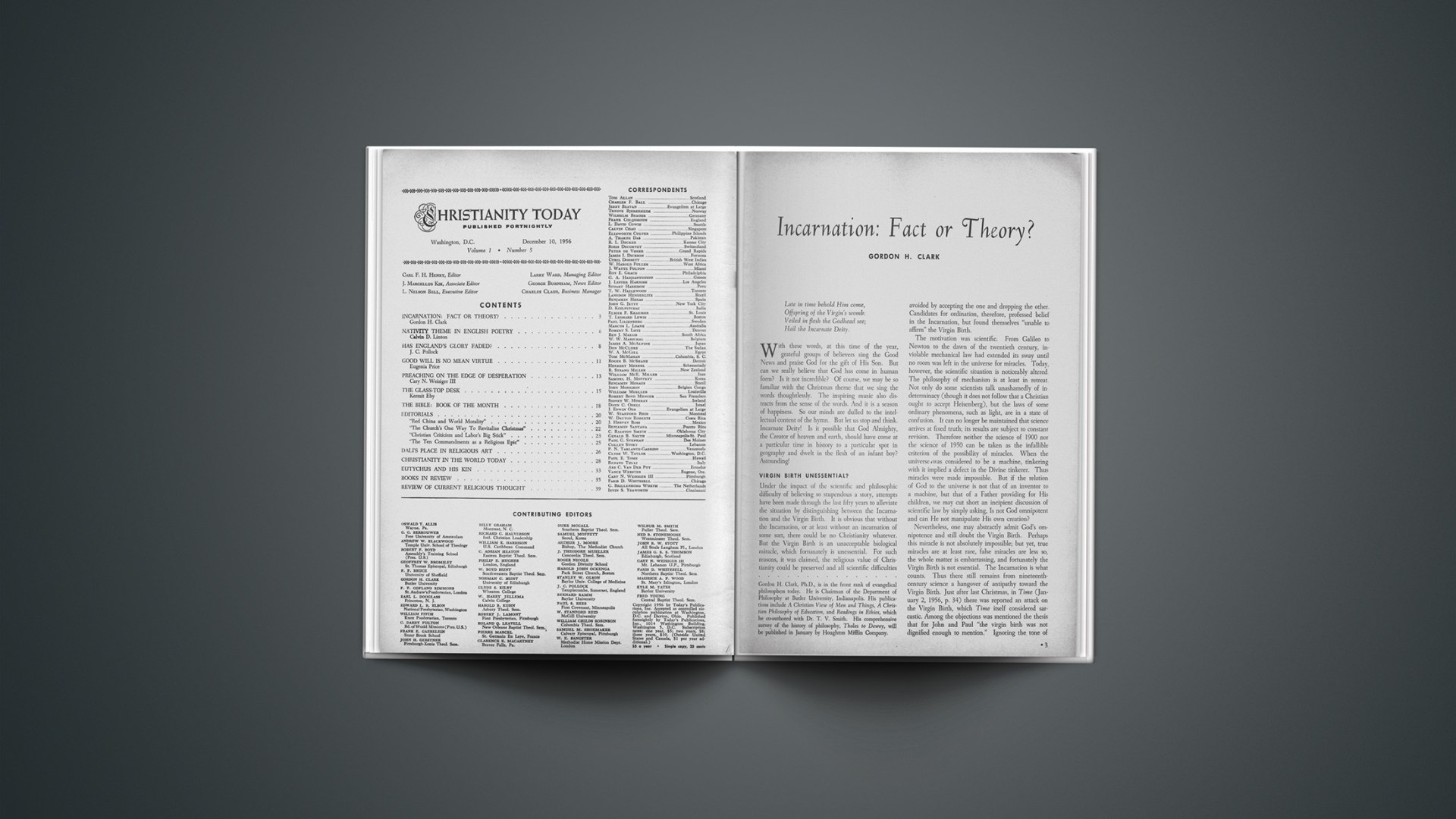 An understanding of this situation demands an answer to the question, What is a fact? Is a fact something true and a theory something false? This cannot quite be the meaning; the document can hardly intend to say that all theories are false. What then does it mean? Does it use “fact” in the sense of an historical event and “theory” in the sense of a general or an abstract principle? This understanding would not lend coherence to the view, since obviously the Virgin Birth is not a general principle. If, of the two, one must be designated a fact and the other a theory, would not the better linguistic usage make the Incarnation a theory to explain the fact of the Virgin Birth rather that the Virgin Birth a theory to explain the fact of the Incarnation?
