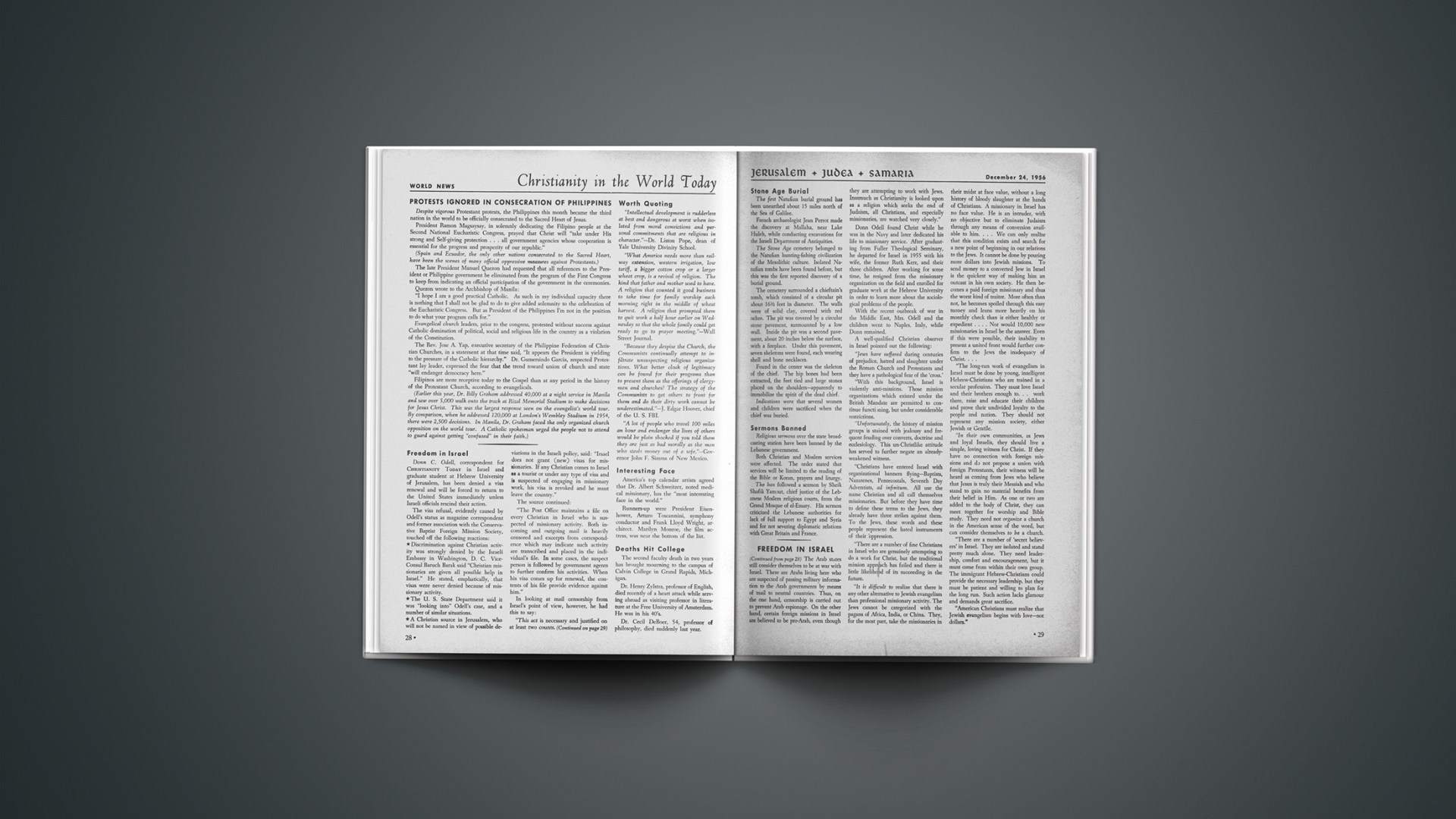 (Earlier this year, Dr. Billy Graham addressed 40,000 at a night service in Manila and saw over 5,000 walk onto the track at Rizal Memorial Stadium to make decisions for Jesus Christ. This was the largest response seen on the evangelist’s world tour. By comparison, when he addressed 120,000 at London’s Wembley Stadium in 1954, there were 2,500 decisions. In Manila, Dr. Graham faced the only organized church opposition on the world tour. A Catholic spokesman urged the people not to attend to guard against getting “confused” in their faith.)