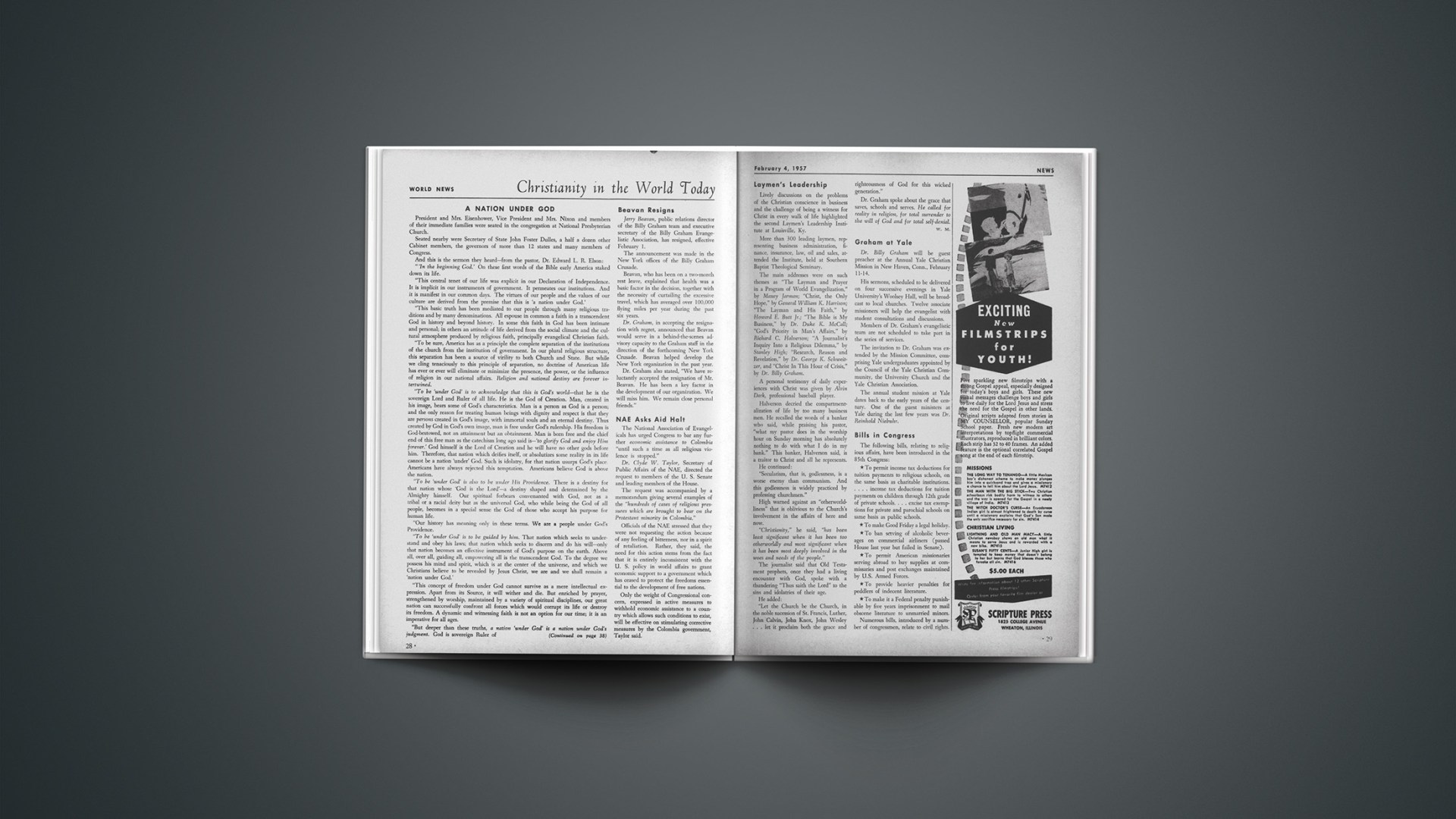 The main addresses were on such themes as “The Layman and Prayer in a Program of World Evangelization,” by Maxey Jarman;“Christ, the Only Hope,” by General William K. Harrison; “The Layman and His Faith,” by Howard E. Butt Jr.; “The Bible is My Business,” by Dr. Duke K. McCall; “God’s Priority in Man’s Affairs,” by Richard C. Halverson; “A Journalist’s Inquiry Into a Religious Dilemma,” by Stanley High; “Research, Reason and Revelation,” by Dr. George K. Schweitzer, and “Christ In This Hour of Crisis,” by Dr. Billy Graham.