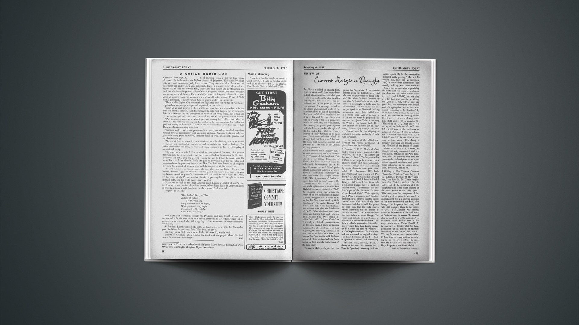 Writing in The Christian Graduate (December, 1956), on “Some Aspects of the Reformed Doctrine of Holy Scripture,” the Rev. H. M. Carson emphasizes that “linked closely to the objective fact of the sufficiency of Holy Scriptures there is the allied doctrine of the inner witness of the Holy Spirit.” This means that “our acceptance of the sufficiency of Scripture is not merely a mental assent, but is a spiritual response to the inner testimony of the Spirit, who brought the Scriptures into being, and who still interprets them to the people of God.” The Christian who adheres firmly to the doctrine of the sufficiency of Scripture can, he asserts, “be assured that he stands in a noble succession”—a succession which reaches back to the early church and to Christ Himself. It is, moreover, a doctrine that has been prominent “at all periods of spiritual awakening in the life of the church.” We, too, for our part, are convinced that, if there is to be a true spiritual awakening in our own day, it will not be apart from the recognition of the sufficiency of Holy Scripture as the Word of God.