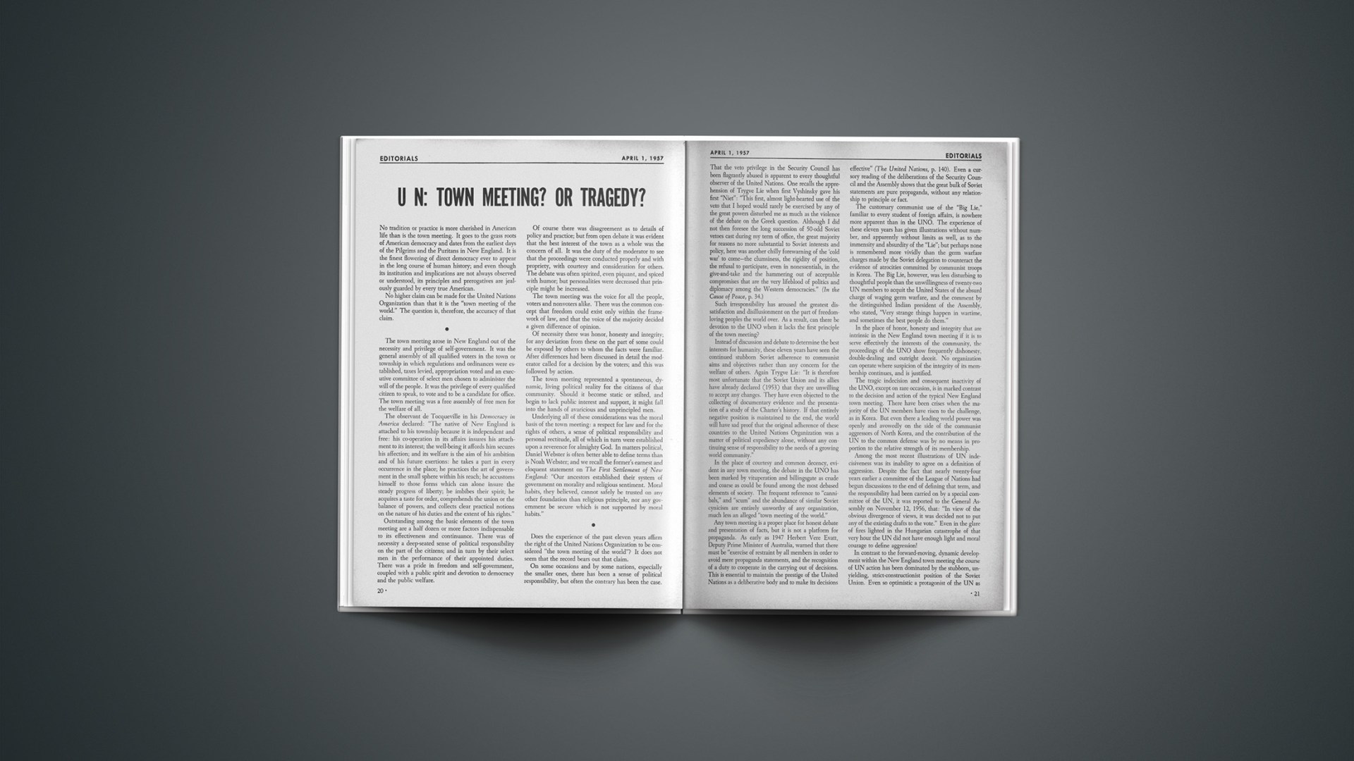 The tragic indecision and consequent inactivity of the UNO, except on rare occasion, is in marked contrast to the decision and action of the typical New England town meeting. There have been crises when the majority of the UN members have risen to the challenge, as in Korea. But even there a leading world power was openly and avowedly on the side of the communist aggressors of North Korea, and the contribution of the UN to the common defense was by no means in proportion to the relative strength of its membership.