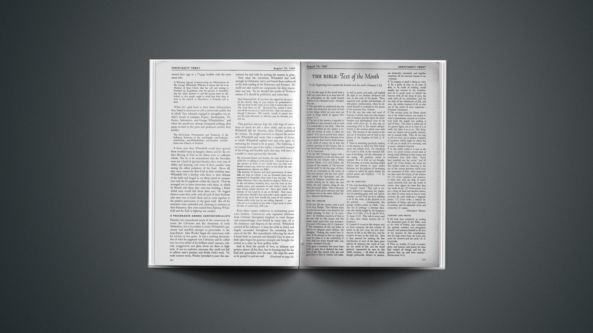 There is something peculiarly striking in the manner in which the Holy Ghost opens this sublime book. He introduces us at once to God, in the essential fullness of his Being, and the solitariness of his acting. All prefatory matter is omitted. It is to God we are brought. We hear him, as it were, breaking earth’s silence, and shining in upon earth’s darkness, for the purpose of developing a sphere in which he might display his eternal power and Godhead.—C. H. MACKINTOSH.