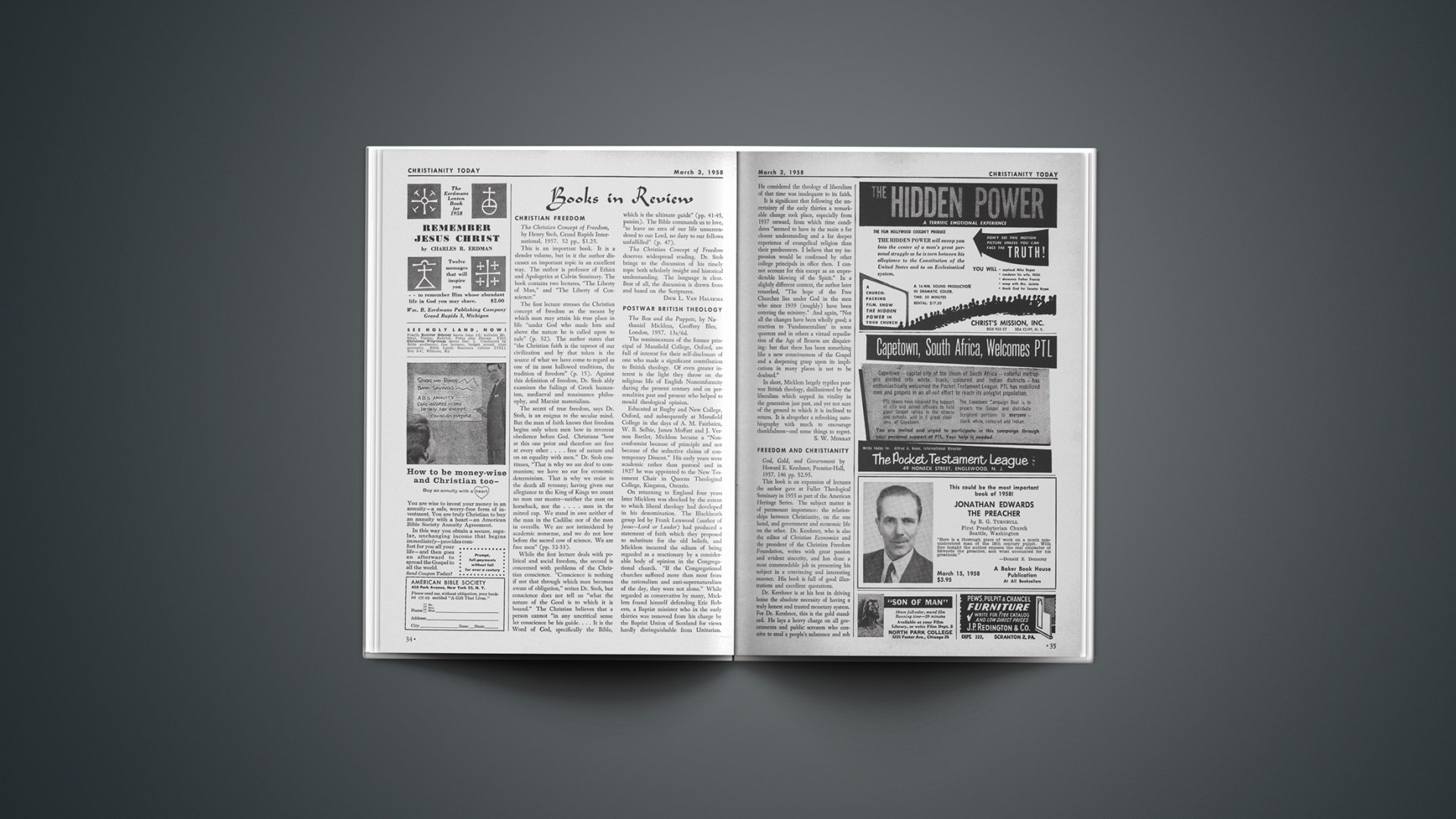 While the first lecture deals with political and social freedom, the second is concerned with problems of the Christian conscience. “Conscience is nothing if not that through which man becomes aware of obligation,” writes Dr. Stob, but conscience does not tell us “what the nature of the Good is to which it is bound.” The Christian believes that a person cannot “in any uncritical sense let conscience be his guide.… It is the Word of God, specifically the Bible, which is the ultimate guide” (pp. 41–45, passim). The Bible commands us to love, “to leave no area of our life unsurrendered to our Lord, no duty to our fellows unfulfilled” (p. 47).