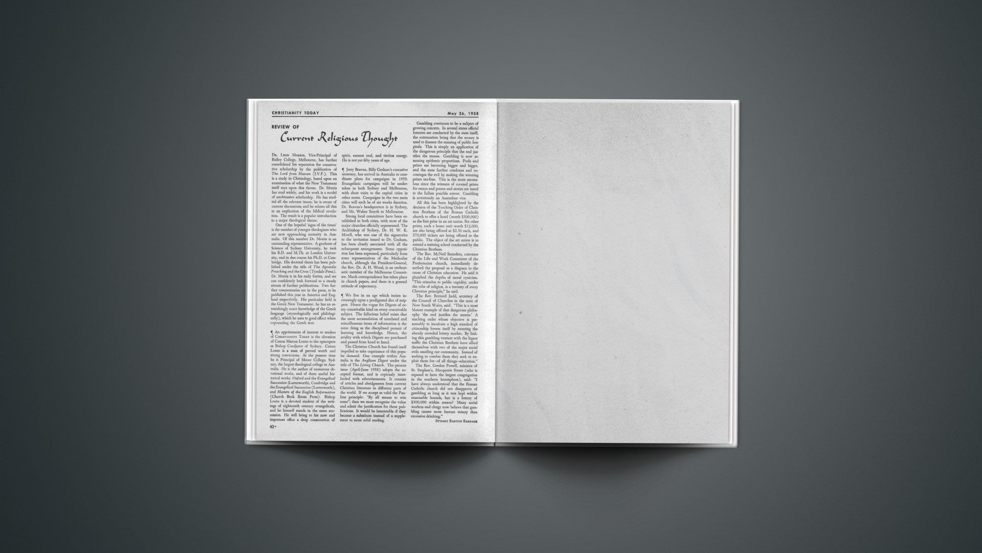 One of the hopeful ‘signs of the times’ is the number of younger theologians who are now approaching maturity in Australia. Of this number Dr. Morris is an outstanding representative. A graduate of Science of Sydney University, he took his B.D. and M.Th. at London University, and in due course his Ph.D. at Cambridge. His doctoral thesis has been published under the title of The Apostolic Preaching and the Cross (Tyndale Press). Dr. Morris is in his early forties, and we can confidently look forward to a steady stream of further publications. Two further commentaries are in the press, to be published this year in America and England respectively. His particular field is the Greek New Testament: he has an astonishingly exact knowledge of the Greek language (etymologically and philologically), which he uses to good effect when expounding the Greek text.