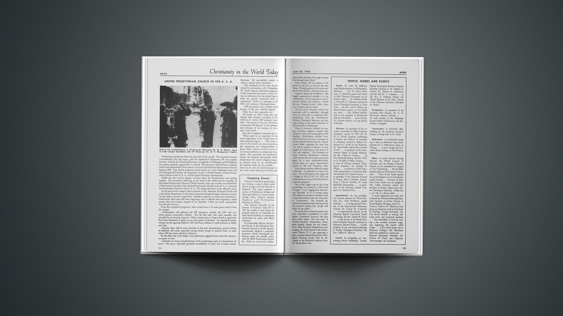 As the press service merger raised eyebrows at the American Newpaper Guild and at the Justice Department, so the latest ecumenical triumph brought measured concern. On the surface, reaction ranged from “amiable acceptance to starry-eyed enthusiasm.” Underneath, there were still some misgivings, even as officials were forgetting a small protest rally and secession requests of six churches. (Only one small congregation was allowed to leave.)