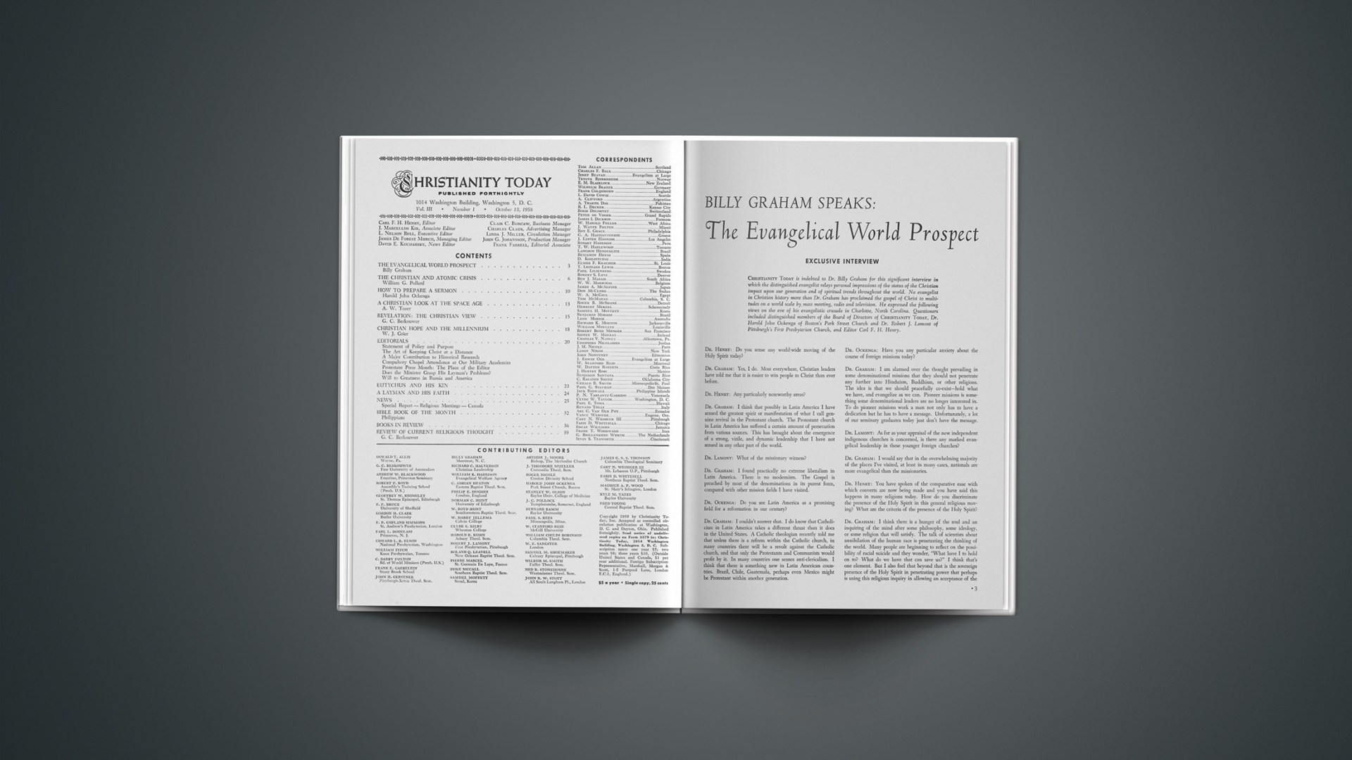 CHRISTIANITY TODAYis indebted to Dr. Billy Graham for this significant interview in which the distinguished evangelist relays personal impressions of the status of the Christian impact upon our generation and of spiritual trends throughout the world. No evangelist in Christian history more than Dr. Graham has proclaimed the gospel of Christ to multitudes on a world scale by mass meeting, radio and television. He expressed the following views on the eve of his evangelistic crusade in Charlotte, North Carolina. Questioners included distinguished members of the Board of Directors ofCHRISTIANITY TODAY, Dr. Harold John Ockenga of Boston’s Park Street Church and Dr. Robert J. Lamont of Pittsburgh’s First Presbyterian Church, and Editor Carl F. H. Henry.
