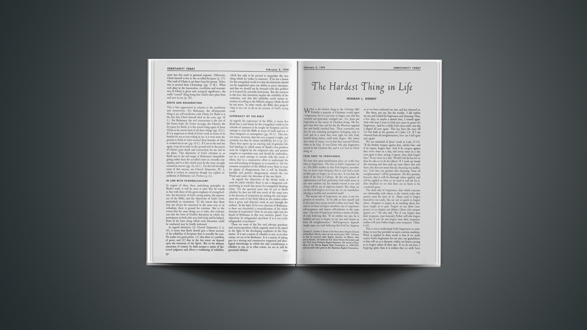 What is the hardest thing in the Christian life? Probably a majority of Christians would agree—forgiveness, for it is not easy to forgive one who has seriously and grievously wronged you. Yet, Jesus put forgiveness at the center of Christian living. He forgave men their sins, and for this the Pharisees opposed him and finally crucified him. Their contention was that he was assuming prerogatives belonging only to God; and in a sense they were right for only God, himself being sinless, could truly forgive. But where they erred, of course, was in that they rejected Christ’s claim to be God. It was Christ who put forgiveness central in the Christian life, and it was God in Christ doing it.