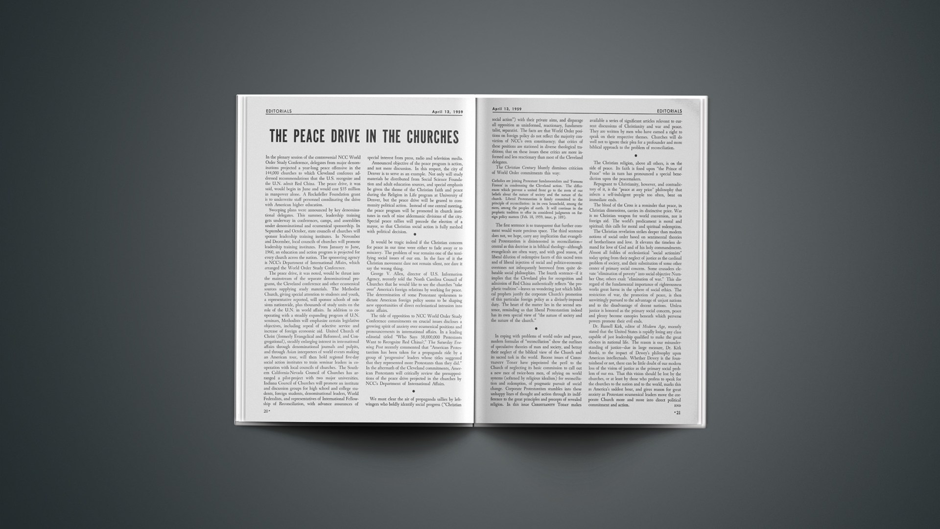 Announced objective of the peace program is action, and not mere discussion. In this respect, the city of Denver is to serve as an example. Not only will study materials be distributed from Social Science Foundation and adult education sources, and special emphasis be given the theme of the Christian faith and peace during the Religion in Life program at University of Denver, but the peace drive will be geared to community political action. Instead of one central meeting, the peace program will be promoted in church institutes in each of nine aldermanic divisions of the city. Special peace rallies will precede the election of a mayor, so that Christian social action is fully meshed with political decision.