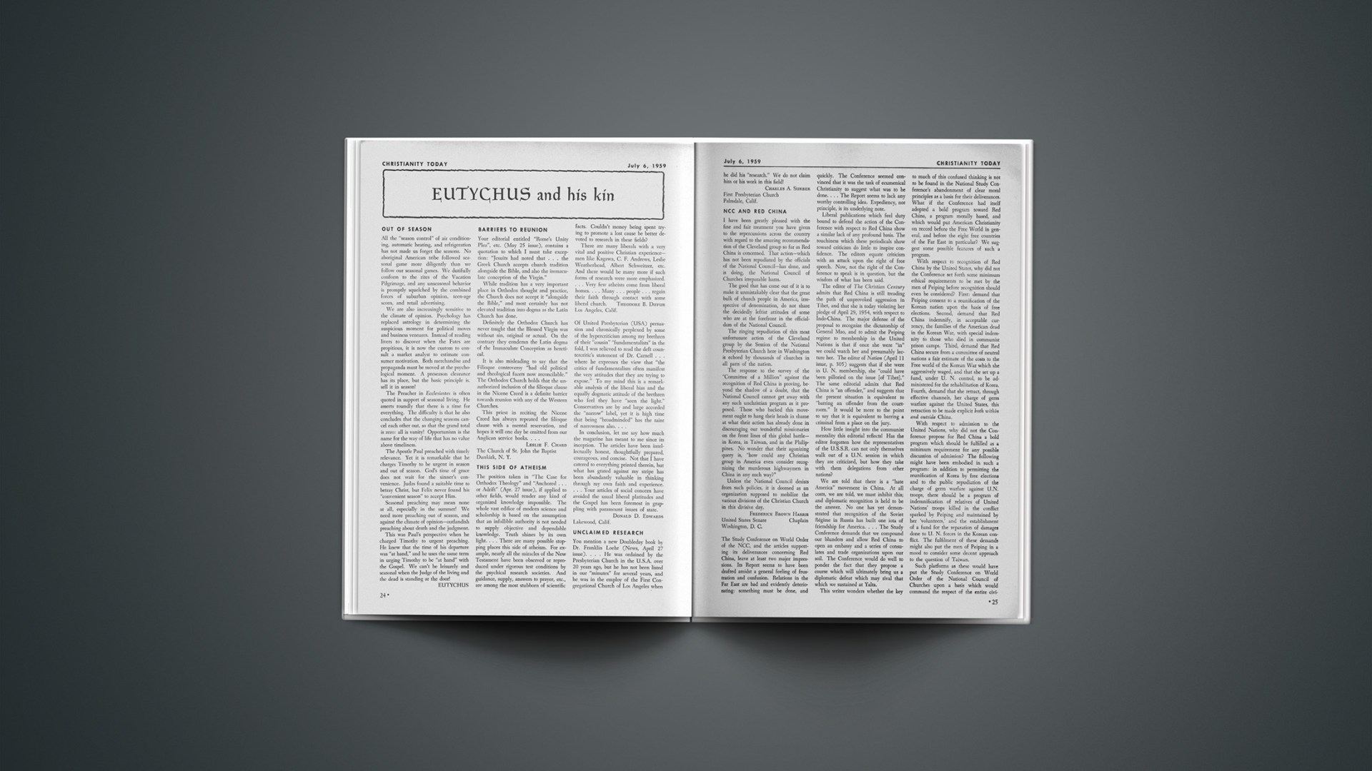 The position taken in “The Case for Orthodox Theology” and “Anchored … or Adrift” (Apr. 27 issue), if applied to other fields, would render any kind of organized knowledge impossible. The whole vast edifice of modern science and scholarship is based on the assumption that an infallible authority is not needed to supply objective and dependable knowledge. Truth shines by its own light.… There are many possible stopping places this side of atheism. For example, nearly all the miracles of the New Testament have been observed or reproduced under rigorous test conditions by the psychical research societies. And guidance, supply, answers to prayer, etc., are among the most stubborn of scientific facts. Couldn’t money being spent trying to promote a lost cause be better devoted to research in these fields?