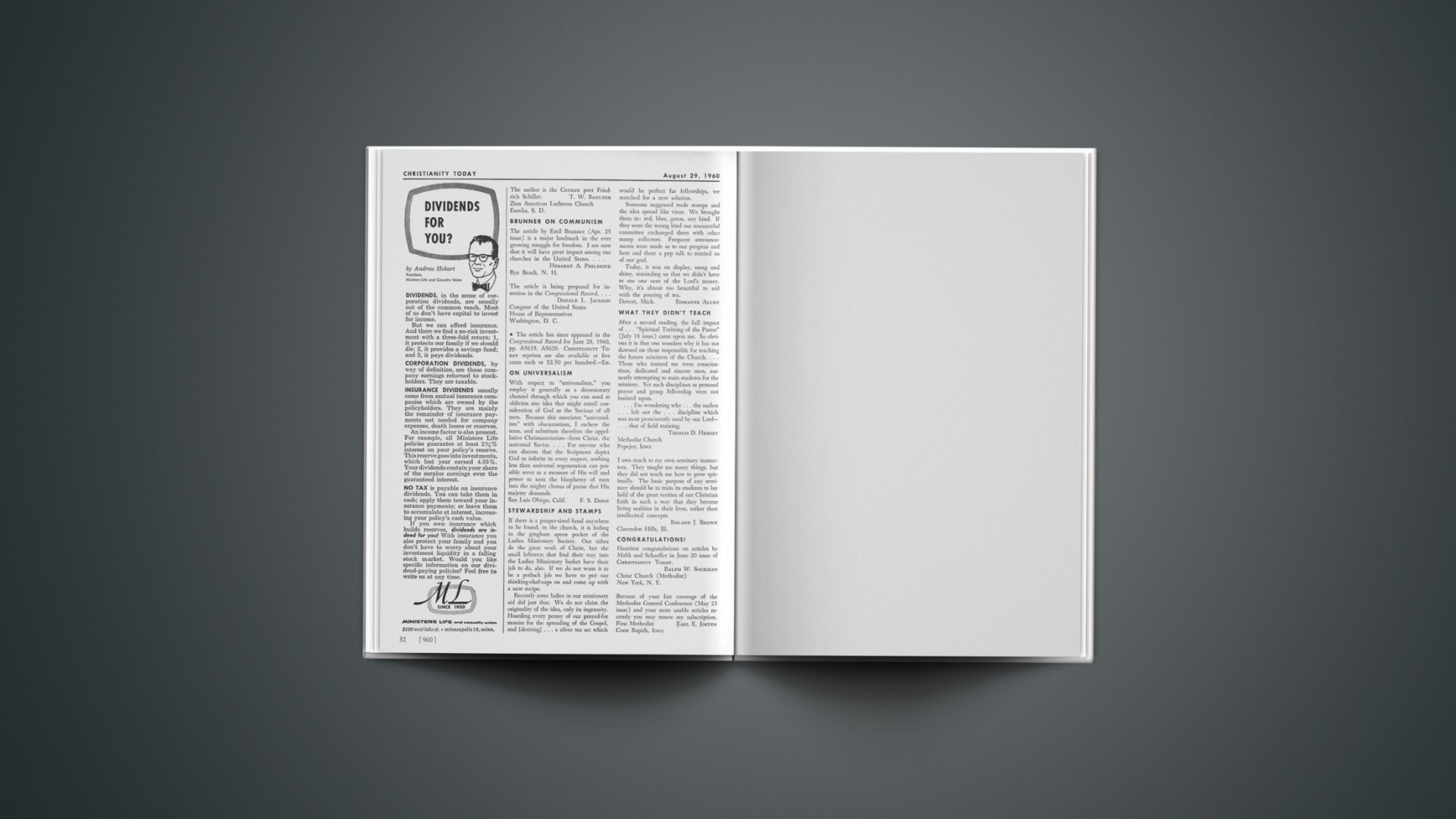 As a means of silencing critics who picture the religious broadcaster as a “huckster,” Bertermann proposes issuance of periodic public financial statements. He urges evangelical Christians, moreover, to support continued access to the broadcasting media by Gospel broadcasters. “We heartily commend the granting of sustaining time, but we assert the basic freedom of a station to sell religious broadcasting time and the basic right of anyone to buy it.”