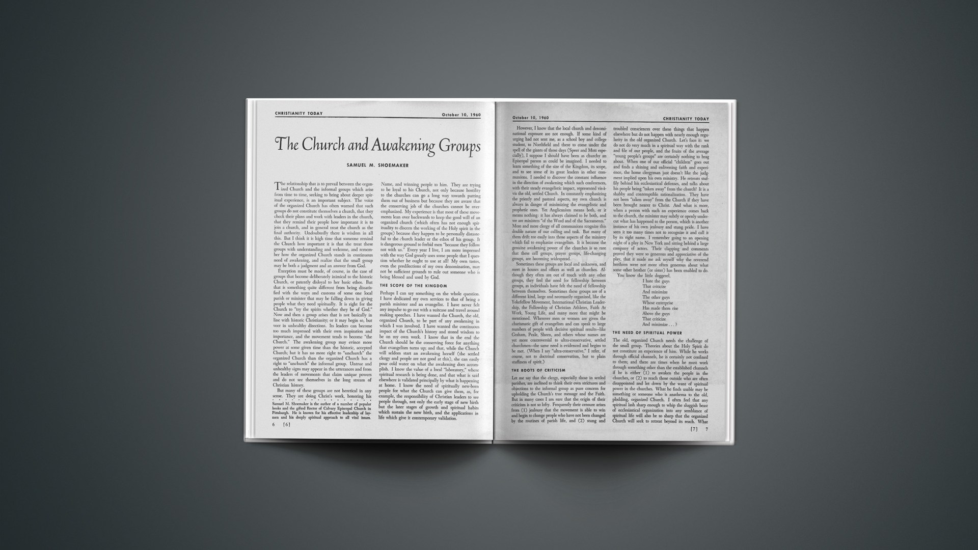 The relationship that is to prevail between the organized Church and the informal groups which arise from time to time, seeking to bring about deeper spiritual experience, is an important subject. The voice of the organized Church has often warned that such groups do not constitute themselves a church, that they check their plans and work with leaders in the church, that they remind their people how important it is to join a church, and in general treat the church as the final authority. Undoubtedly there is wisdom in all this. But I think it is high time that someone remind the Church how important it is that she treat these groups with understanding and welcome, and remember how the organized Church stands in continuous need of awakening, and realize that the small group may be both a judgment and an answer from God.
