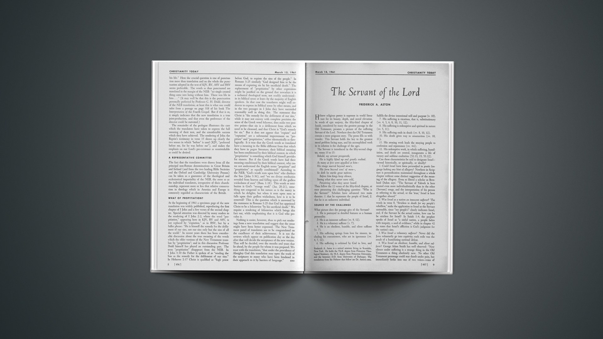 Hebrew religious poetry is supreme in world literature for its beauty, depth, and moral elevation. In words of epic majesty, the fifty-third chapter of Isaiah, considered by many the greatest passage in the Old Testament, presents a picture of the suffering Servant of the Lord. Nowhere does the Old Testament contain a more poignant story. The poem fills us with wonder. This Servant holds the key to the greatest moral problem facing man, and his accomplished work in its solution is the challenge of the ages.