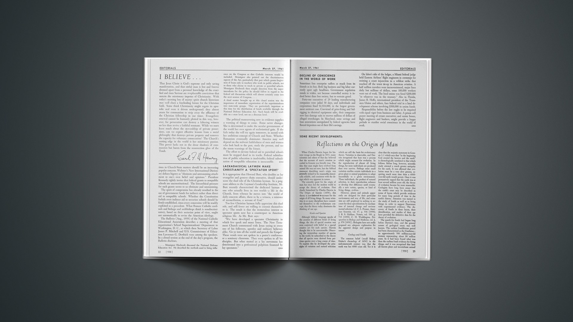 The search for primitive man was perhaps first rewarded with the discovery of Neanderthal man near the Neander River in Germany in 1856. Dated geologically to be 60,000 years old, Neanderthal man is said to represent an early stone age culture in Europe and is often called the first cave dweller. The original 14 bones were reconstructed by Boule into a hunched-back creature with head thrust forward, knees bent, and flat feet. In 1957, Neanderthal man was rereconstructed and found to be posturally identical to modern man and in other respects essentially human (cf. L. Eiseley, Quarterly Review of Biology, vol. 32, p. 323 [1957]; F. C. Howell, ibid., p. 330; W. L. Straus, Jr., and A. J. E. Cave, ibid., p. 348). Subsequently the assignment of separate species status for many fossil hominids which, like Neanderthal man were considered to be distinctly outside the known limits of human variation, has been questioned (cf. W. E. LeGros Clark, American Scientist, vol. 47, p. 299 [1959]). The recent studies of Australopithecus, the southern ape-man of Africa, have resulted in controversy over its meaning and importance in the problem of man’s origin (cf. Nature, vol. 183, p. 159 [1959]). The discovery of Zinjanthropus in Kenya by Dr. Leakey similarly provides evidence used to support the concept of the animal origin of man. In each case, however, it is clear that the ages which have been assigned are uncertain. Until reliable dating is done, it cannot really be known whether these fossils represent possible evolutionary intermediates. Without this information a logical sequence of fossils cannot be constructed. It is therefore not surprising that the scientific search for the course of man’s origin remains obscure. (cf. W. L. Straus, Jr., Quarterly Review of Biology, vol. 24, p. 200 [1949]; F. C. Howell, Science, vol. 130, p. 831 [1959]).