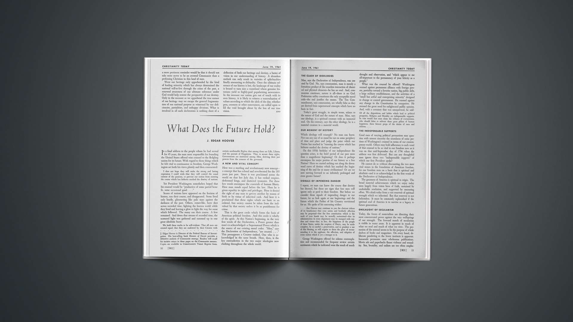 I repeat, no man can know the course that destiny has decreed, but there are signs that free men will ignore only at peril to their freedom. But before we consider those signals of impending danger to our future, let us look again at our beginnings and the future which the Father of his Country envisioned for us. He spoke of his unceasing wishes: