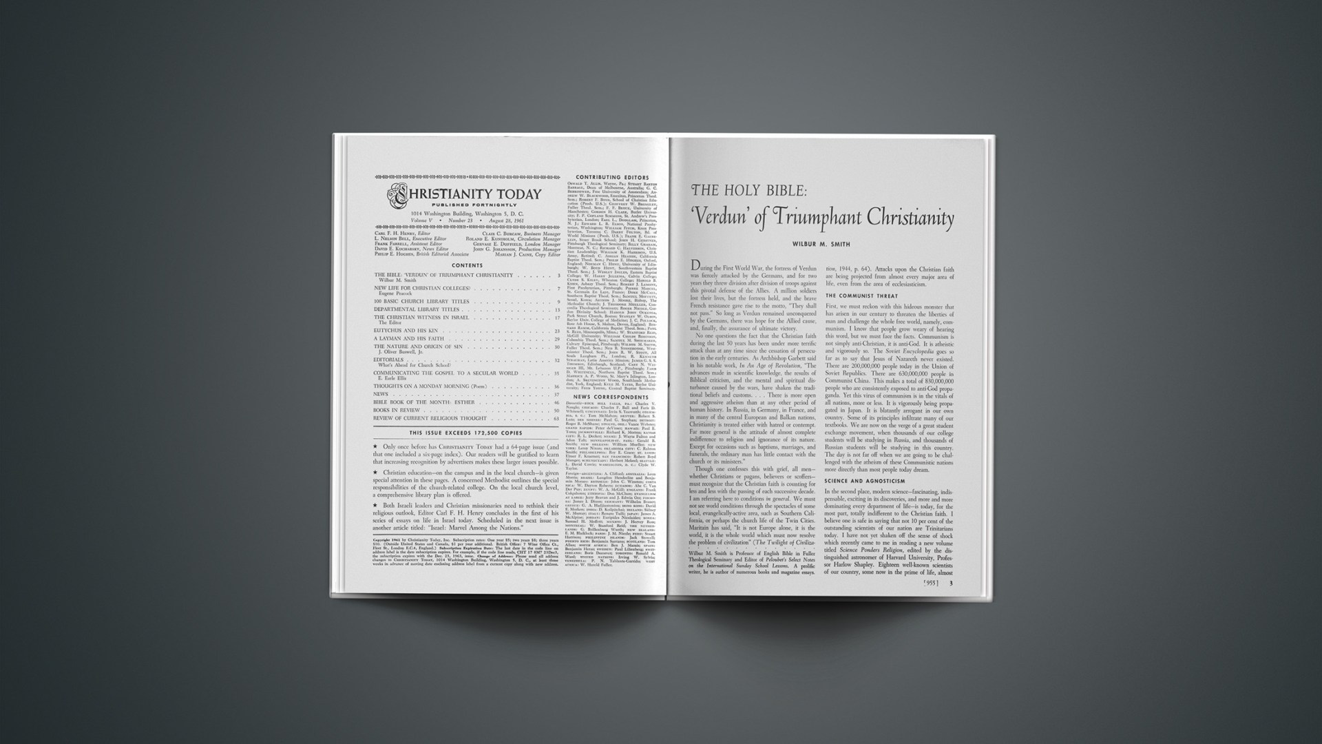 In the second place, modern science—fascinating, indispensable, exciting in its discoveries, and more and more dominating every department of life—is today, for the most part, totally indifferent to the Christian faith. I believe one is safe in saying that not 10 per cent of the outstanding scientists of our nation are Trinitarians today. I have not yet shaken off the sense of shock which recently came to me in reading a new volume titled Science Ponders Religion, edited by the distinguished astronomer of Harvard University, Professor Harlow Shapley. Eighteen well-known scientists of our country, some now in the prime of life, almost all of them with distinguished careers in teaching in our larger colleges and universities, attempt in this book to set forth their conceptions of religion. Let us remember these men are not purposely attacking Christianity. They are not writing from Moscow, but from the United States. And yet not one of these scientists confesses that he believes in a personal, sovereign, omnipotent God, nor does one of them confess to any sure hope of personal life after death. Not only is their own position agnostic, but they frankly say they represent a true cross-section of what scientists today think about religion, and I am quite sure that in this they are correct. As Dr. Leslie Newbigin has said, “The typical and dominant scientific man of the West is to a large extent alienated from the Christian tradition. It is impossible to exaggerate the importance of the fact that at the moment when the scientific culture, which was formed within the Western Christian tradition, has achieved world-wide expansion and dominance, its unity with the supernatural faith in which it was begotten has disintegrated” (“Summons to Christian Mission Today” in the International Review of Missions, Apr., 1959, p. 178).