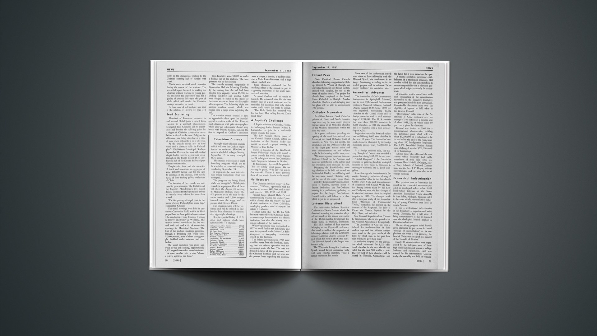 Now in the 1960’s, America is in the fifth period of its religious life. More than half a century has passed since the last awakening led by Moody. Two world wars have come and gone. They have torn American life asunder. Indications everywhere point to needed spiritual awakening. The divorce rate has quadrupled since 1890, has doubled since 1918. Between 1950 and 1958 illegitimate births increased over 45 per cent; in 1958 alone 79,000 of the 308,700 illegitimate children were born to teenagers between the ages of 15 and 19. According to the F.B.I., crimes have been increasing four times as rapidly as the population. In 1959 there were almost 1,600,000 classifiable crimes among which were registered 8,600 murders, 15,000 rapes, and almost 700,000 burglaries. New York City alone had over 17,000 automobile thefts and those mostly by teenagers. In 1940 there were 173,706 people in prisons and reformatories; in 1959 there were 207,513. Some TV shows have been fixed, some labor unions have been headed by known gangsters, and some prominent business men have been convicted of collusion in illegal price fixing. All these facts point to the need for spiritual, moral refreshing. It may well be asked, “Watchman, what of the night?”