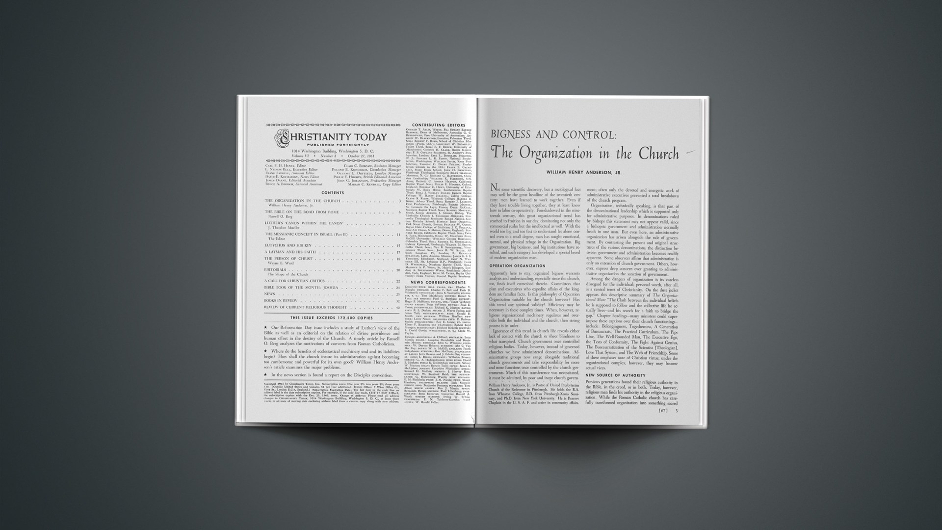 Apparently here to stay, organized bigness warrants analysis and understanding, especially since the church, too, finds itself enmeshed therein. Committees that plan and executives who expedite affairs of the kingdom are familiar facts. Is this philosophy of Operation Organization suitable for the church however? Has this trend any spiritual validity? Efficiency may be necessary in these complex times. When, however, religious organizational machinery regulates and overrides both the individual and the church, then strong protest is in order.
