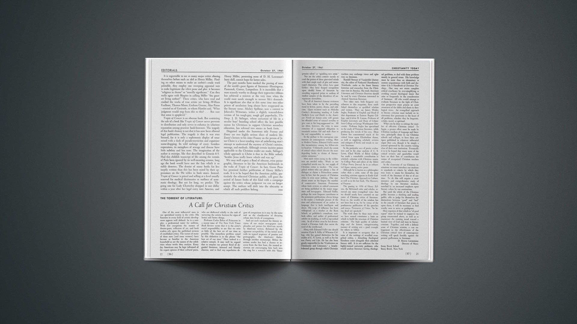 More such voices crying in the wilderness are needed today. Weak as our evangelical novels may be, our supply of Christian critics is weaker. The evangelical writers who can phrase a line of dialogue or rhyme a Petrarchian sonnet may be few, but the paucity of Christian critics is even more striking. One may almost count on his fingers the number of conservative American Protestants whose book reviews or critical comments are being published in the major magazines and newspapers. Edmund Fuller, perhaps the most frequent contributor to the prominent publications, always brings to his reader a forthright picture of the aims and achievements of an author in language that is both intelligent and direct. Elis scope of influence has been widespread: as a teacher at the Kent School; as publisher’s consultant, textbook editor, and author of professional articles on teaching, as well as top-ranked critic. In all of these areas he has demonstrated a Christian faith that meets the need of the intellectual.