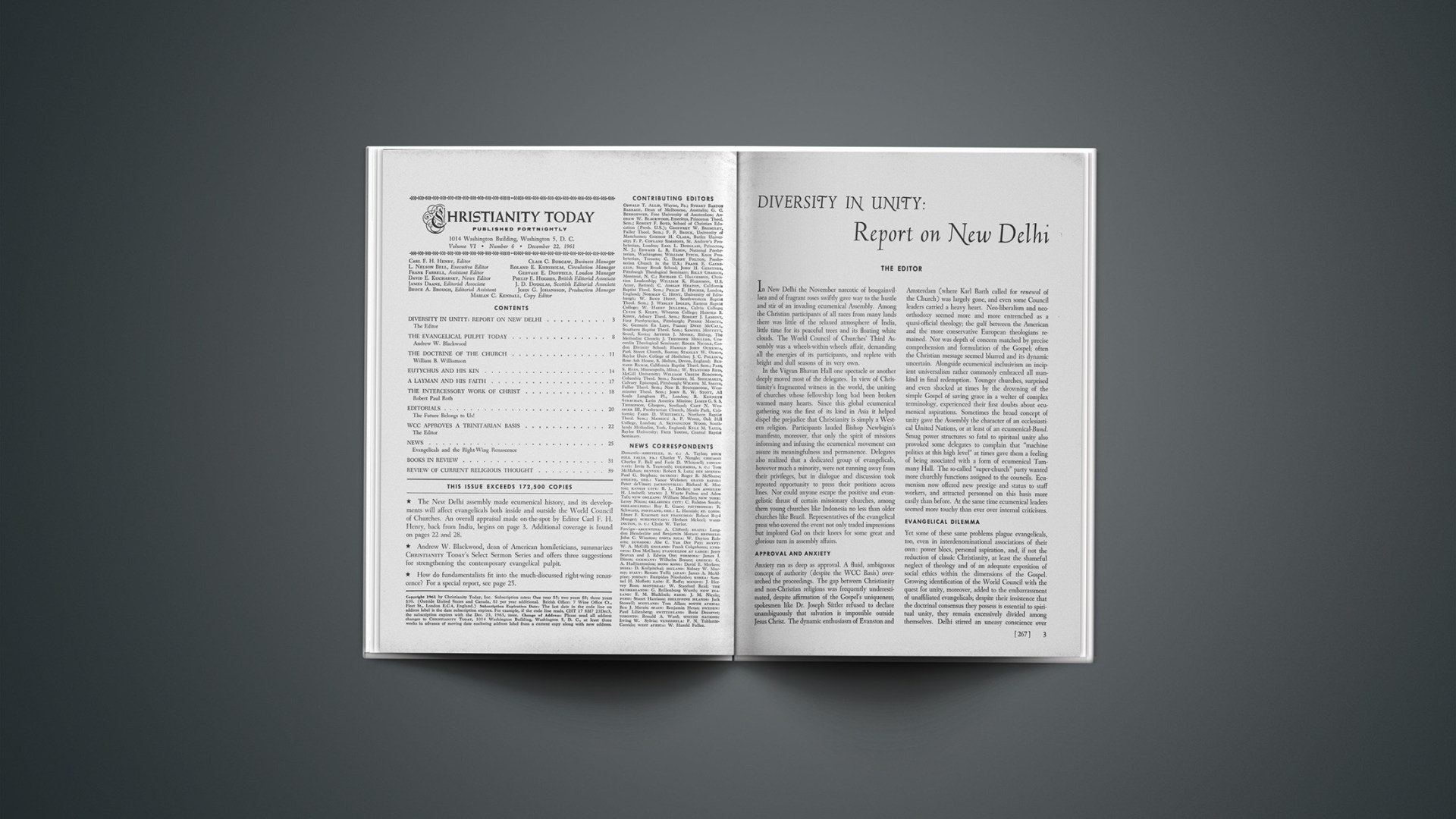At Delhi evangelical participants were being driven to ask more deeply than ever before whether the renewal of the Church is being achieved through the present ecumenical process of ecclesiastical elephantiasis. They were left with the vexing question whether the widening Orthodox ecclesiastical trend already so neutralizes the Protestant orientation that they, no less than unaffiliated evangelicals, may soon find the climate of WCC less compatible than will the Roman Catholics. Not a few were disturbed that ecumenical assimilation in many respects now looks more like a pious version of the U. N. than like a recapturing of the essence of New Testament community. The Statesman in Delhi observed that distinguished speakers were “confounding confusion” in their divergent approaches and proposed solutions to “the schismatic disunity of the One United Church.” As some leaders rebuked those who prize their separate traditions, others asked with fresh awareness whether the glory of particular denominational expressions does not lie in their recovery and preservation of Christian truths and practices neglected by the large groups. Yet the vital churches engaged in the Delhi encounter still seemed confident they would not lose their distinctiveness in the expanding sacramental-ritual atmosphere. They still encouraged unaffiliated Protestants to identify themselves in order to augment evangelical influences within; nowhere was discontent so deep as to breed the desire for detachment. Apprehension was evident, however, over Roman Catholicism’s becoming the next ecumenical target. On the one hand, evangelicals have more in common theologically with Rome than with ecumenical inclusivism; but they would have less in common with ecumenical ecclesiology were Rome to join the stream.