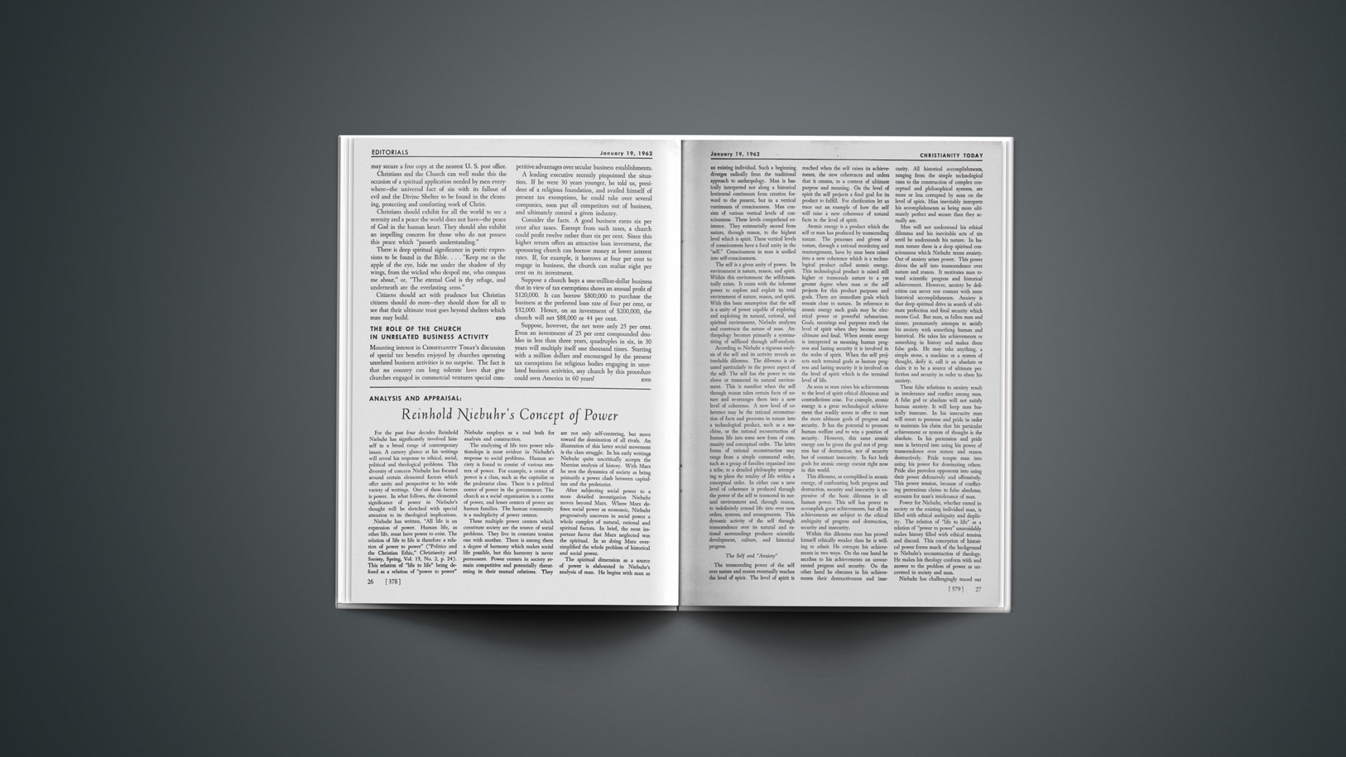 For the past four decades Reinhold Niebuhr has significantly involved himself in a broad range of contemporary issues. A cursory glance at his writings will reveal his response to ethical, social, political and theological problems. This diversity of concern Niebuhr has focused around certain elemental factors which offer unity and perspective to his wide variety of writings. One of these factors is power. In what follows, the elemental significance of power in Niebuhr’s thought will be sketched with special attention to its theological implications.