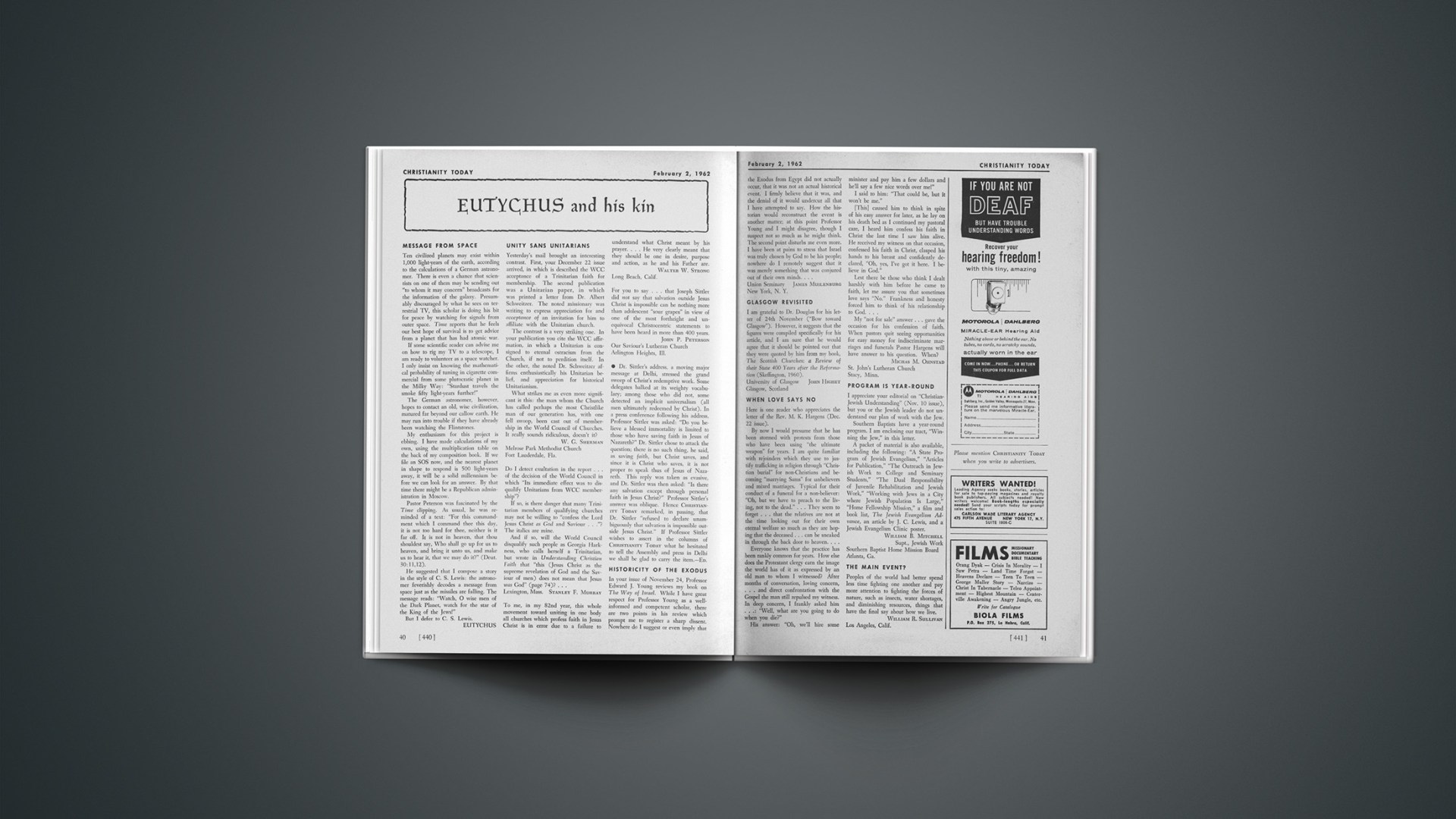 • Dr. Sittler’s address, a moving major message at Delhi, stressed the grand sweep of Christ’s redemptive work. Some delegates balked at its weighty vocabulary; among those who did not, some detected an implicit universalism (all men ultimately redeemed by Christ). In a press conference following his address, Professor Sittler was asked: “Do you believe a blessed immortality is limited to those who have saving faith in Jesus of Nazareth?” Dr. Sittler chose to attack the question; there is no such thing, he said, as saving faith, but Christ saves, and since it is Christ who saves, it is not proper to speak thus of Jesus of Nazareth. This reply was taken as evasive, and Dr. Sittler was then asked: “Is there any salvation except through personal faith in Jesus Christ?” Professor Sittler’s answer was oblique. Hence CHRISTIANITY TODAY remarked, in passing, that Dr. Sittler “refused to declare unambiguously that salvation is impossible outside Jesus Christ.” If Professor Sittler wishes to assert in the columns of CHRISTIANITY TODAY what he hesitated to tell the Assembly and press in Delhi we shall be glad to carry the item.—ED.