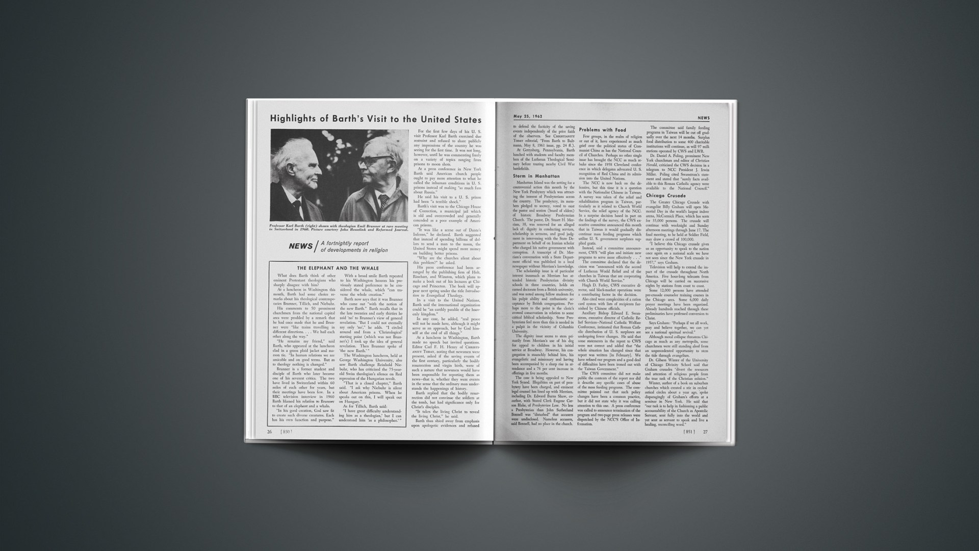 “He remains my friend,” said Barth, who appeared at the luncheon clad in a green plaid jacket and maroon tie. “In human relations we are amicable and on good terms. But as to theology nothing is changed.” Brunner is a former student and disciple of Barth who later became one of his severest critics. The two have lived in Switzerland within 60 miles of each other for years, but their meetings have been few. In a BBC television interview in 1960 Barth likened his relation to Brunner to that of an elephant and a whale.
