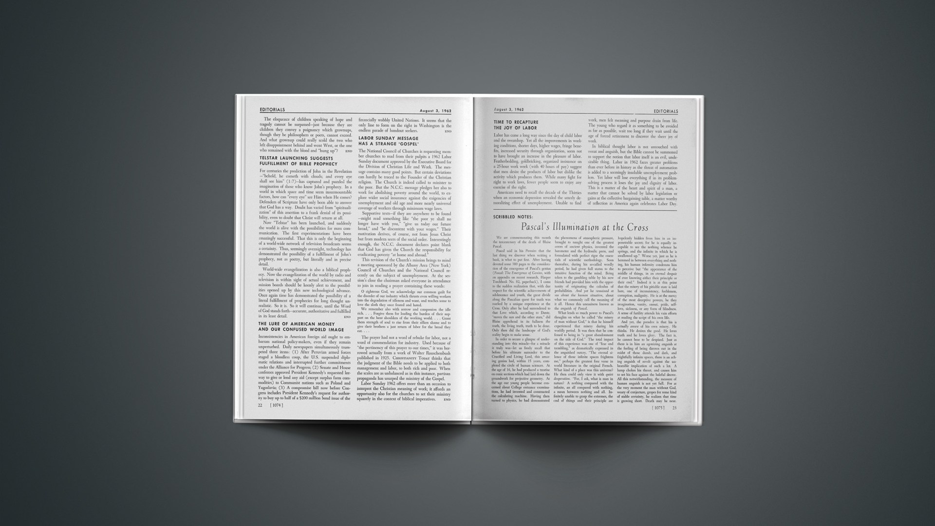 In order to secure a glimpse of understanding into this miracle—for a miracle it truly was—let us freely recall that before his ultimate surrender to the Crucified and Living Lord, this amazing genius had, within 15 years, completed the circle of human sciences. At the age of 16, he had produced a treatise on conic sections which had laid down the groundwork for projective geometry. At the age our young people become concerned about College entrance examinations, he had invented and constructed the calculating machine. Having then turned to physics, he had demonstrated the phenomena of atmospheric pressure, brought to naught one of the greatest errors of ancient physics, invented the barometer and the hydraulic press, and formulated with perfect rigor the essentials of scientific methodology. Soon thereafter, during his so-called wordly period, he had given full status to the intuitive function of the mind. Being taken to the gambling table by his new friends had provided him with the opportunity of originating the calculus of probabilities. And yet he remained at sea about the human situation, about what we commonly call the meaning of it all. Hence this uneasiness known as the anguish of Pascal.
