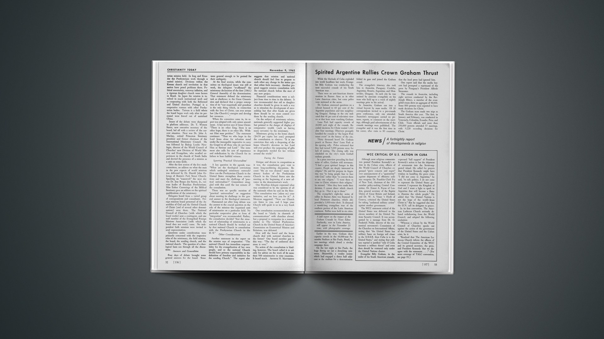 Evangelist Billy Graham, in the midst of his South American crusade, expressed “full support” of President Kennedy’s action to bar the shipment of armaments into the Soviet-supported island. He called for prayers that President Kennedy might have wisdom in handling the grave crisis. “I did not come to Argentina,” he said, “to talk politics. I do not come to represent the United States government. I represent the Kingdom of God and I want a light to spark in Argentina that will become a flame to illumine the whole people.” He added that “the United Nations is not the hope of the world—Jesus Christ is.” But he suggested also that the U.N. call its delegates to prayer.