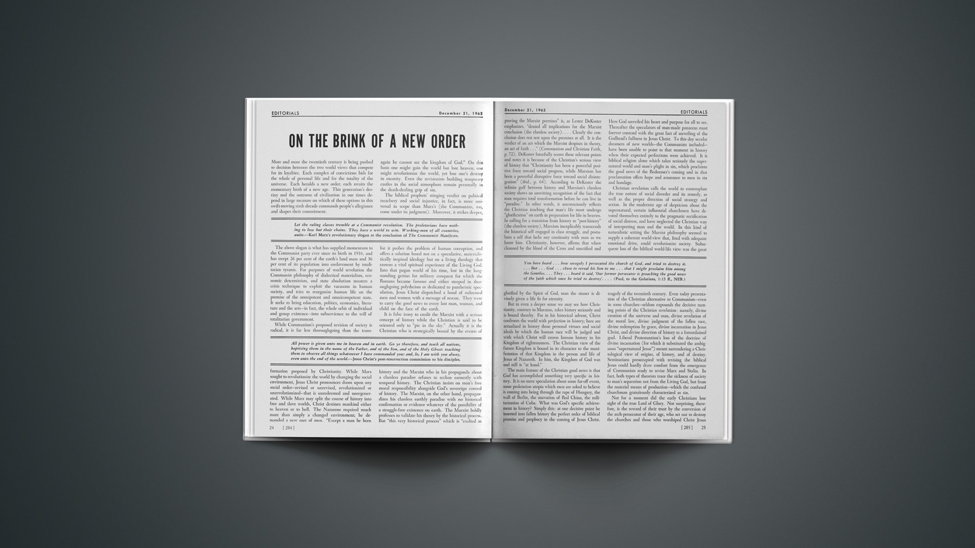 More and more the twentieth century is being pushed to decision between the two world views that compete for its loyalties. Each complex of convictions bids for the whole of personal life and for the totality of the universe. Each heralds a new order; each awaits the momentary birth of a new age. This generation’s destiny and the outcome of civilization in our times depend in large measure on which of these options in this swift-moving sixth decade commands people’s allegiance and shapes their commitment.