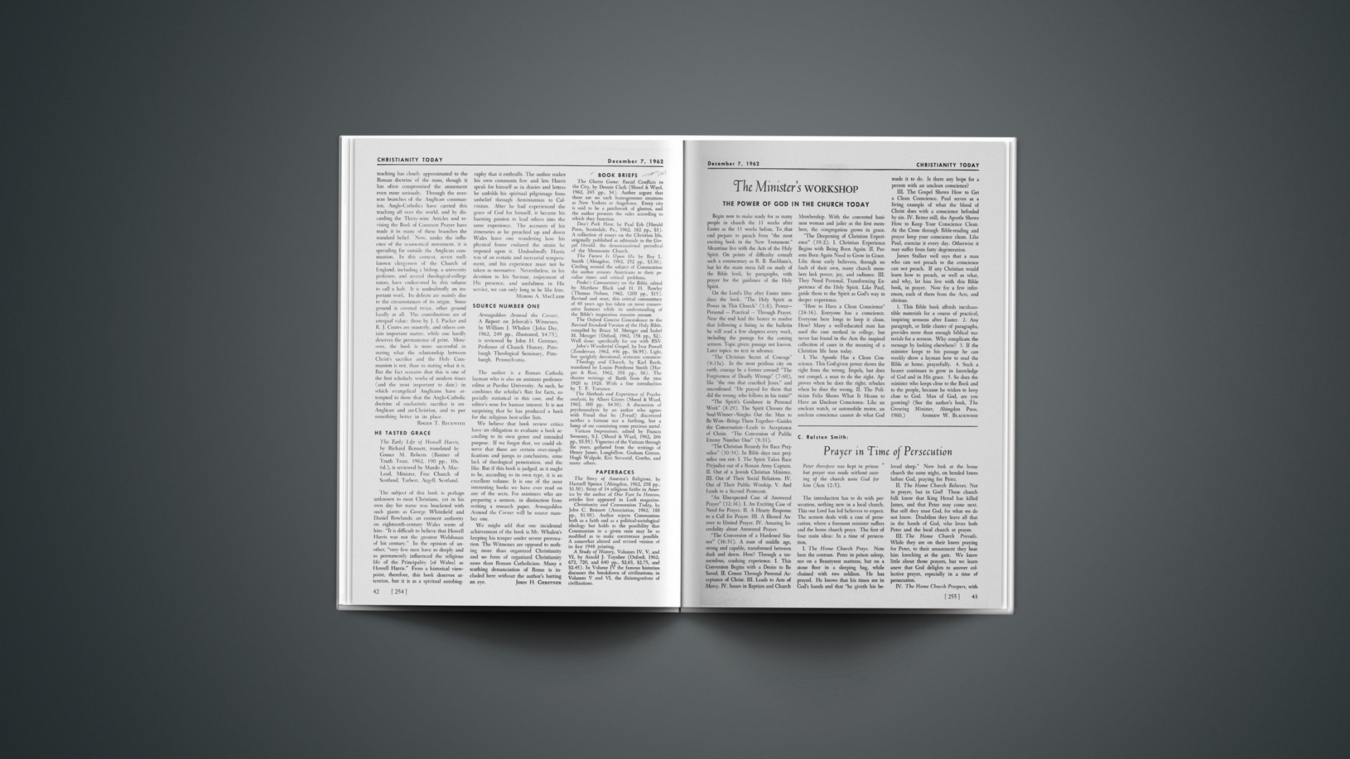 Dedicated to assisting the clergy in the preparation of sermons, the feature titled The Minister’s Workshop appears in the first issue of each month. The section’s introductory essay is contributed alternately by Dr. Andrew W. Blackwood and Dr. Paul S. Rees. The feature includes, also, Dr. Blackwood’s abridgments of expository-topical sermons, outlines of significant messages by great preachers of the past, and outlines or abridgments of messages presented by expository preachers of our own time.—ED.