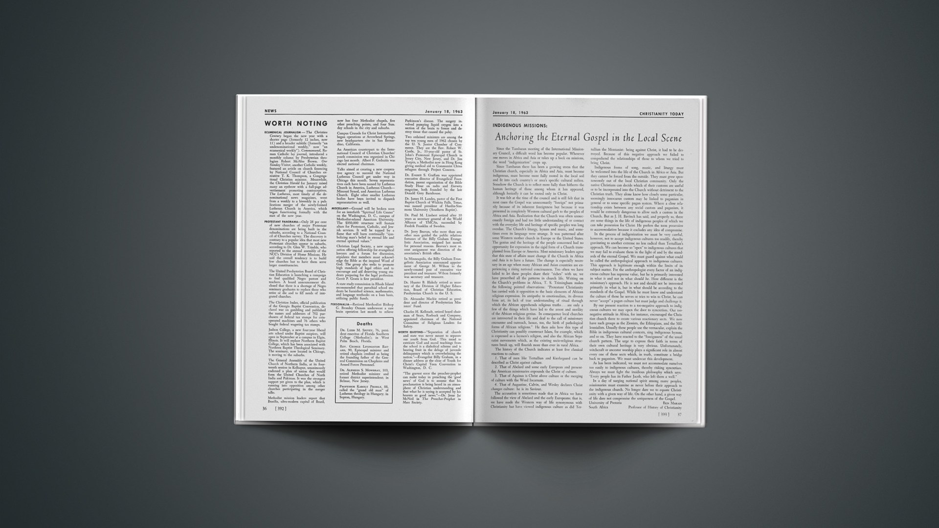 ECUMENICAL JOURNALISM—The Christian Century began the new year with a shorter page (formerly 12 inches, now 11) and a broader subtitle (formerly “an undenominational weekly,” now “an ecumenical weekly”). Commonweal, Roman Catholic lay journal, introduced a monthly column by Presbyterian theologian Robert McAfee Brown. Our Sunday Visitor, another Catholic weekly, featured an article on church financing by National Council of Churches executive T. K. Thompson, a Congregational Christian minister. Meanwhile, the Christian Herald for January raised many an eyebrow with a full-page advertisement promoting contraceptives. The Lutheran, most timely of the denominational news magazines, went from a weekly to a biweekly in a publications merger of the newly-formed Lutheran Church in America, which began functioning formally with the start of the new year.