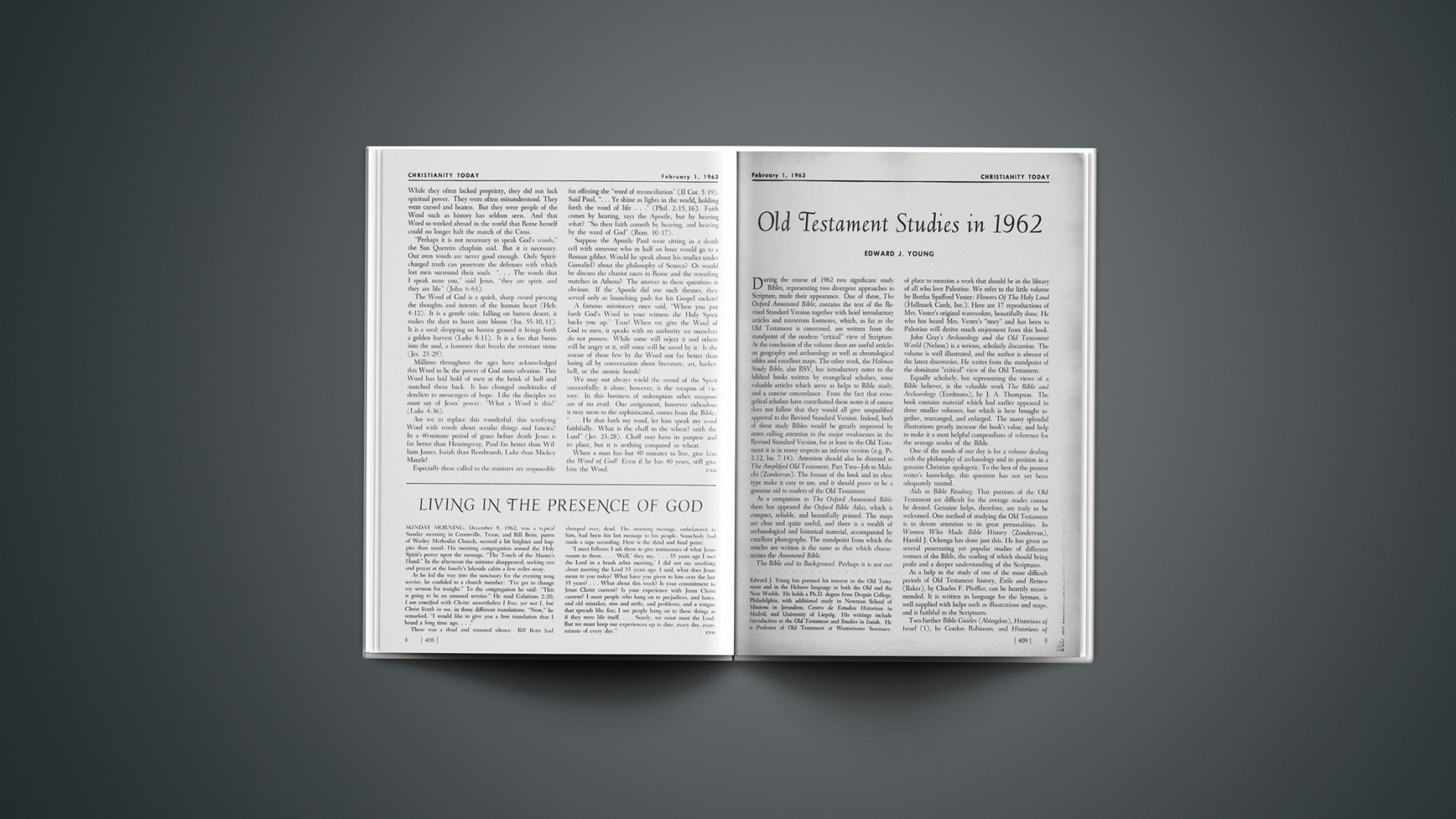 During the course of 1962 two significant study Bibles, representing two divergent approaches to Scripture, made their appearance. One of these, The Oxford Annotated Bible, contains the text of the Revised Standard Version together with brief introductory articles and numerous footnotes, which, as far as the Old Testament is concerned, are written from the standpoint of the modern “critical” view of Scripture. At the conclusion of the volume there are useful articles on geography and archaeology as well as chronological tables and excellent maps. The other work, the Holman Study Bible, also RSV, has introductory notes to the biblical books written by evangelical scholars, some valuable articles which serve as helps to Bible study, and a concise concordance. From the fact that evangelical scholars have contributed these notes it of course does not follow that they would all give unqualified approval to the Revised Standard Version. Indeed, both of these study Bibles would be greatly improved by notes calling attention to the major weaknesses in the Revised Standard Version, for at least in the Old Testament it is in many respects an inferior version (e.g. Ps. 2:12; Isa. 7:14). Attention should also be directed to The Amplified Old Testament, Part Two—Job to Malachi (Zondervan). The format of the book and its clear type make it easy to use, and it should prove to be a genuine aid to readers of the Old Testament.