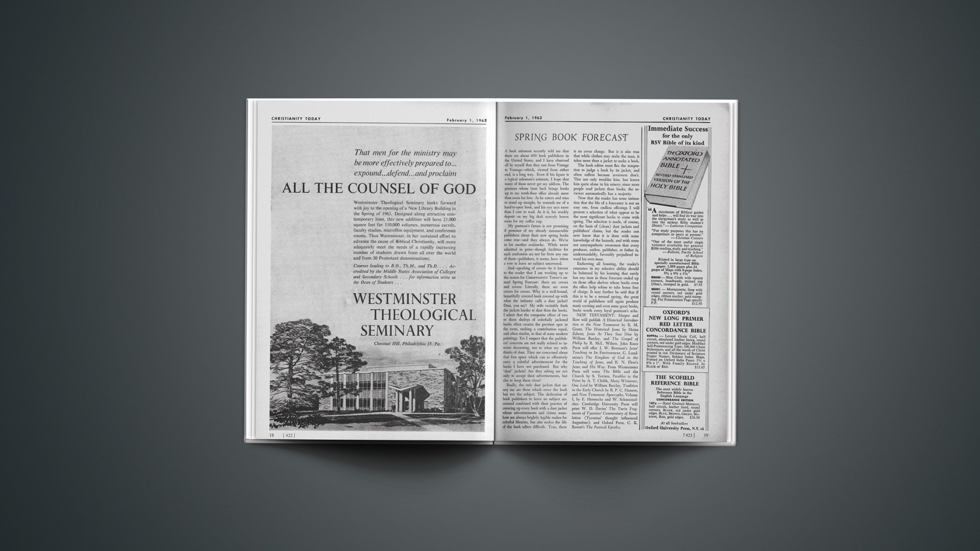 And—speaking of covers—be it known to the reader that I am working up to the reason for CHRISTIANITY TODAY’s annual Spring Forecast: there are covers and covers. Literally, there are even covers for covers. Why is a well-bound, beautifully covered book covered up with what the industry calls a dust jacket? Dust, you say? My wife veritably finds the jackets harder to dust than the books. I admit that the composite effect of two or three shelves of colorfully jacketed books often creates the prettiest spot in the room, making a contribution equal, and often similar, to that of some modern paintings. Yet I suspect that the publishers’ concerns are not really related to interior decorating, nor to what my wife thinks of dust. They are concerned about that free space which can so effectively carry a colorful advertisement for the books I have not purchased. But why “dust” jackets? Are they asking me not only to accept their advertisements, but also to keep them clean?