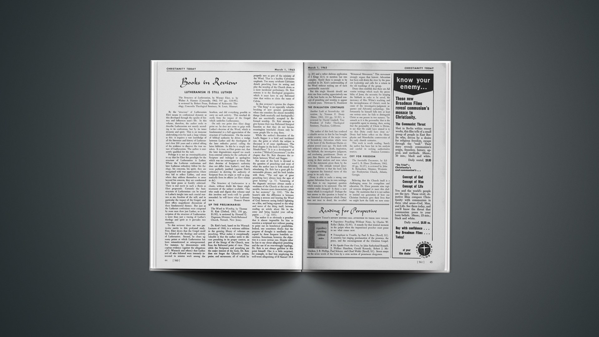The Structure of Lutheranism, by Werner Elert, tr. by Walter A. Hansen (Concordia, 1962, 547 pp., $10.95), is reviewed by Robert Preus, Professor of Systematic Theology, Concordia Theological Seminary, St. Louis, Missouri.