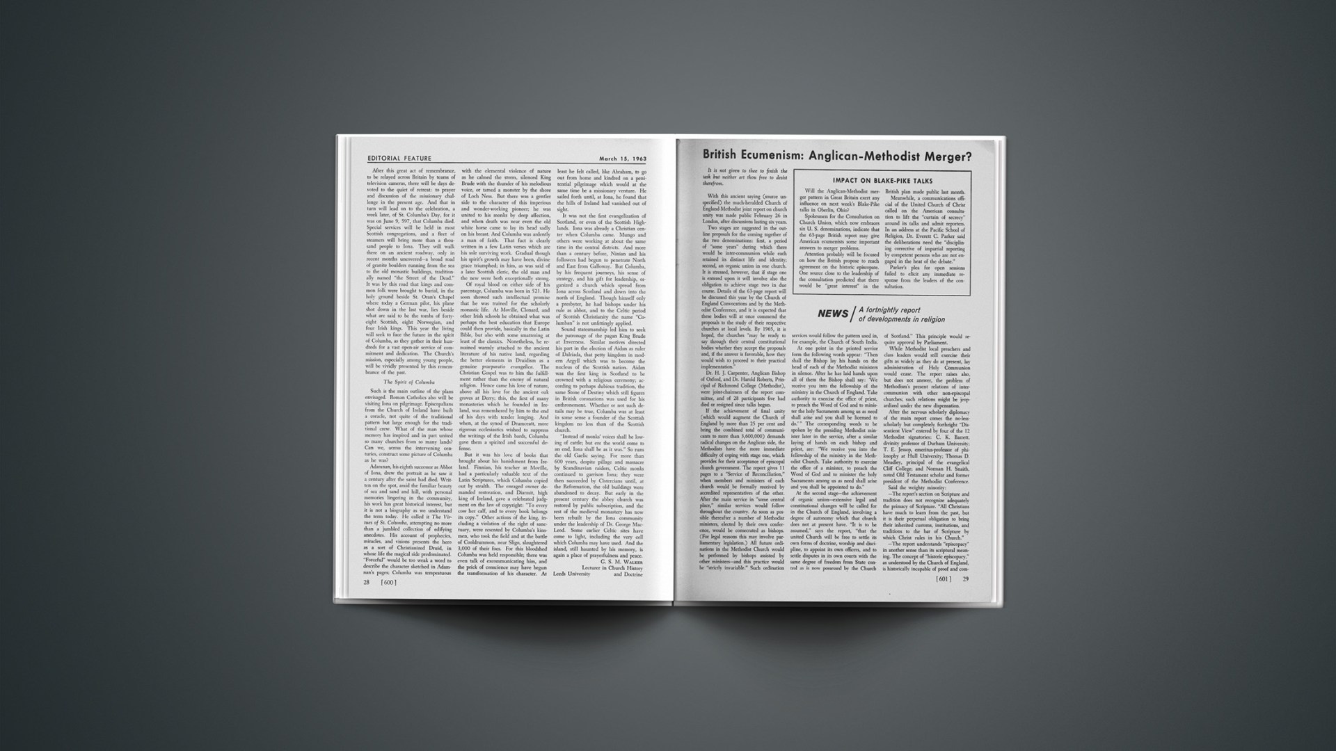 Two stages are suggested in the outline proposals for the coming together of the two denominations: first, a period of “some years” during which there would be inter-communion while each retained its distinct life and identity; second, an organic union in one church. It is stressed, however, that if stage one is entered upon it will involve also the obligation to achieve stage two in due course. Details of the 63-page report will be discussed this year by the Church of England Convocations and by the Methodist Conference, and it is expected that these bodies will at once commend the proposals to the study of their respective churches at local levels. By 1965, it is hoped, the churches “may be ready to say through their central constitutional bodies whether they accept the proposals and, if the answer is favorable, how they would wish to proceed to their practical implementation.”