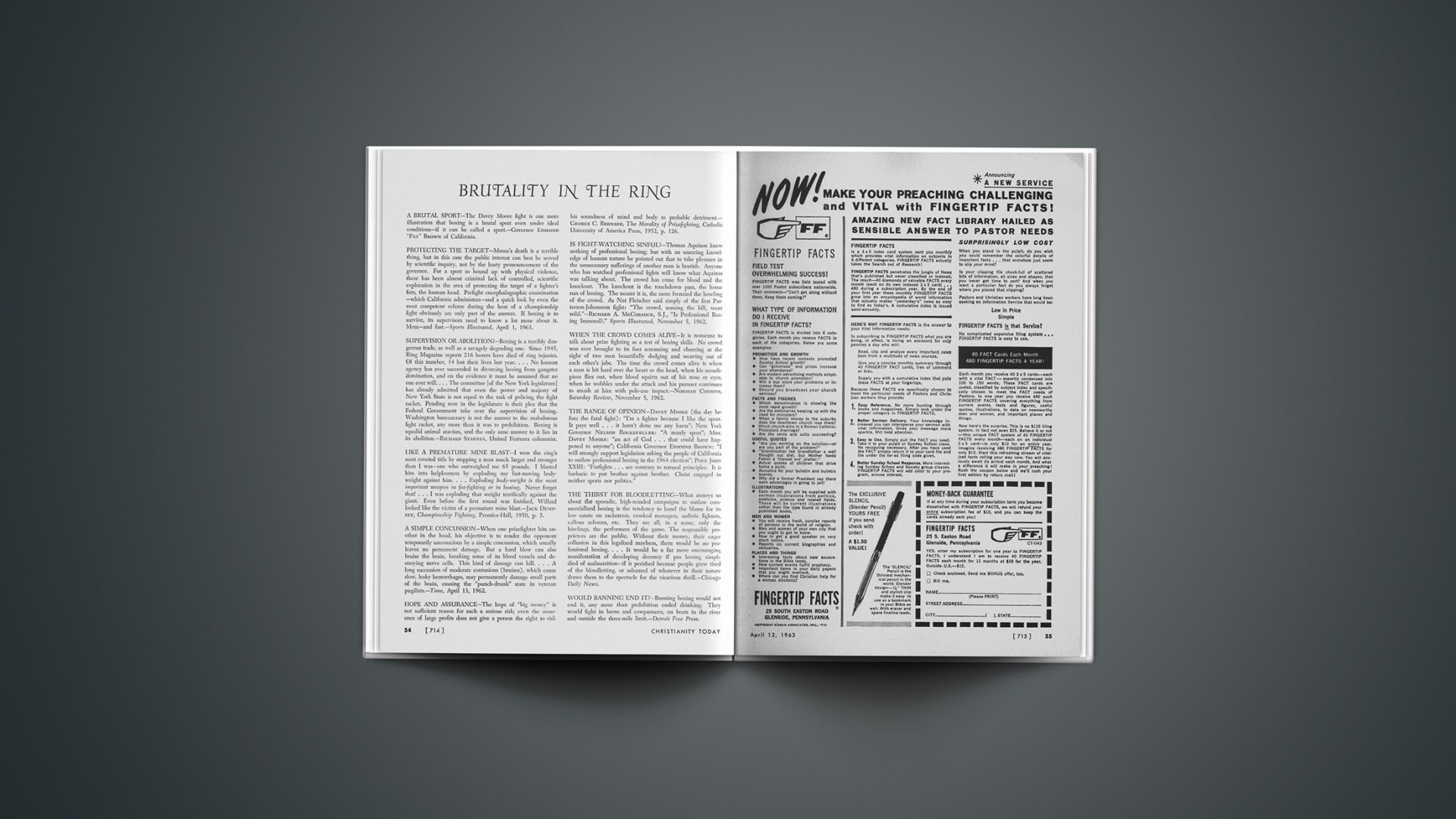 THE RANGE OF OPINION—DAVEY MOORE (the day before the fatal fight): “I’m a fighter because I like the sport. It pays well … it hasn’t done me any harm”; New York GOVERNOR NELSON ROCKEFELLER: “A manly sport”; MRS. DAVEY MOORE: “an act of God … that could have happened to anyone”; California Governor EDMUND BROWN: “I will strongly support legislation asking the people of California to outlaw professional boxing in the 1964 election”; POPE JOHN XXIII: “Fistfights … are contrary to natural principles. It is barbaric to put brother against brother. Christ engaged in neither sports nor politics.”