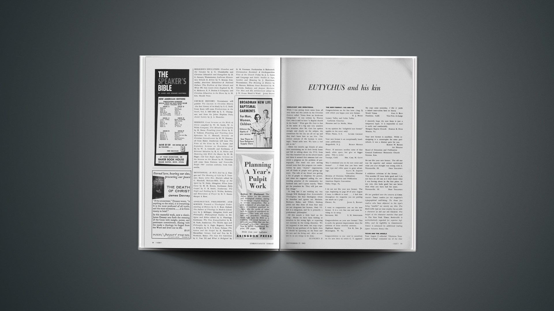 We are gratified over the concern ofCHRISTIANITY TODAYreaders for the magazine’s typographical well-being. To those few readers who have objected to the type’s being “smaller” we merely say this: The Baskerville type we now employ has as wide a character as did our old Fairfield. The height of the character matches that used in The New York Times. Baskerville is authoritatively regarded for superior legibility, and its legibility inCHRISTIANITY TODAYis enhanced by additional leading (space between lines).—ED.