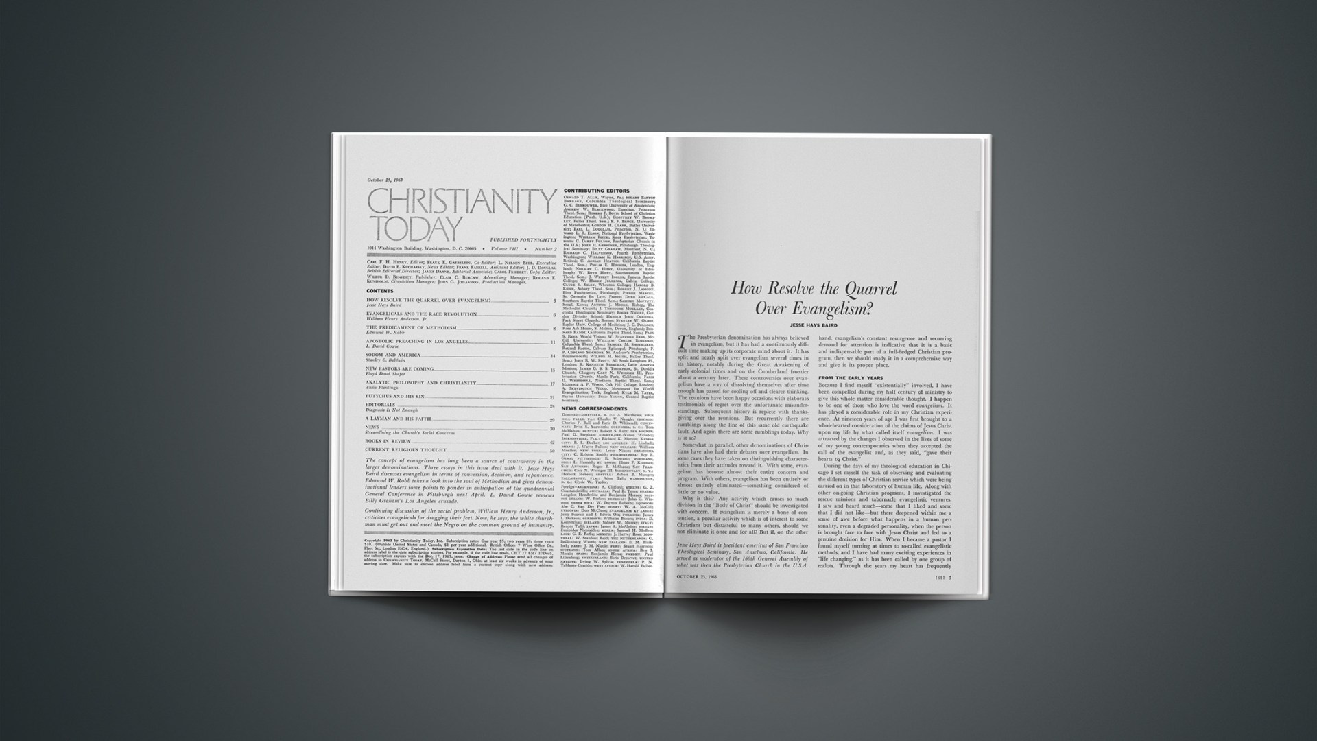 The concept of evangelism has long been a source of controversy in the larger denominations. Three essays in this issue deal with it. Jesse Hays Baird discusses evangelism in terms of conversion, decision, and repentance. Edmund W. Robb takes a look into the soul of Methodism and gives denominational leaders some points to ponder in anticipation of the quadrennial General Conference in Pittsburgh next April. L. David Cowie reviews Billy Graham’s Los Angeles crusade.