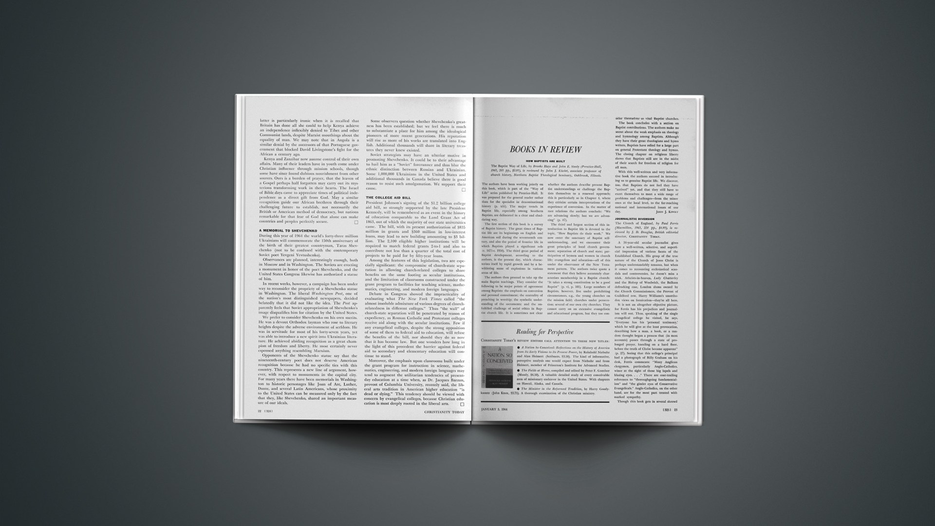 The third and largest section of this introduction to Baptist life is devoted to the topic, “How Baptists do their work.” We now enter the sanctuary of Baptist self-understanding, and we encounter their great principles of local church government; separation of church and state; participation of laymen and women in church life; evangelism and education—all of this under the observance of the New Testament pattern. The authors twice quote a statement that they believe accurately characterizes membership in a Baptist church: “It takes a strong constitution to be a good Baptist” (p. vi, p. 105). Large numbers of Baptists, however, live under prohibiting circumstances, e.g., the young churches on the mission field; churches under persecution; several of our own city churches. They cannot carry on an extensive evangelistic and educational program, but they too consider themselves as vital Baptist churches.