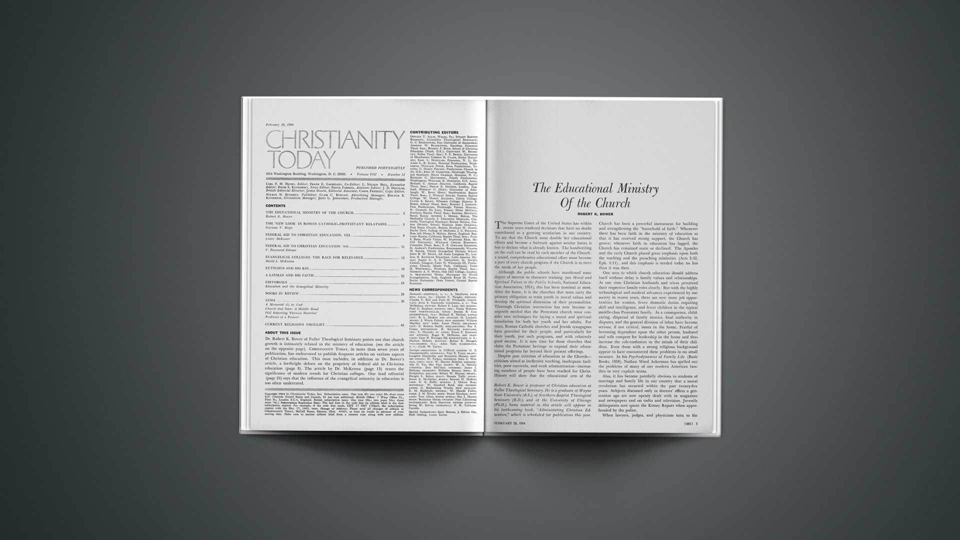 Dr. Robert K. Bower of Fuller Theological Seminary points out that church growth is intimately related to the ministry of education (see the article on the opposite page). CHRISTIANITY TODAY, in more than seven years of publication, has endeavored to publish frequent articles on various aspects of Christian education. This issue includes, in addition to Dr. Bower’s article, a forthright debate on the propriety of federal aid to Christian education (page 8). The article by Dr. McKenna (page 13) traces the significance of modern trends for Christian colleges. Our lead editorial (page 24) says that the influence of the evangelical minority in education is too often underrated.