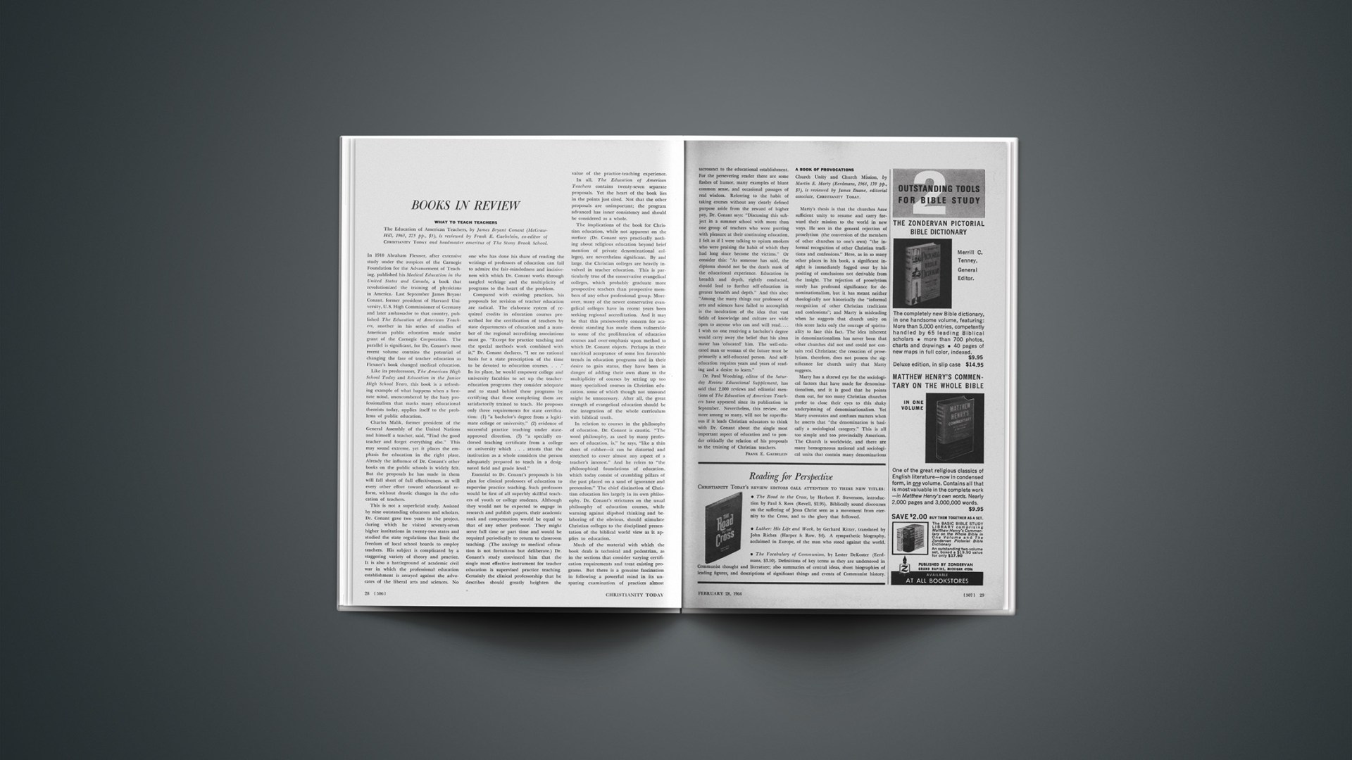 Dr. Paul Woodring, editor of the Saturday Review Educational Supplement, has said that 2,000 reviews and editorial mentions of The Education of American Teachers have appeared since its publication in September. Nevertheless, this review, one more among so many, will not be superfluous if it leads Christian educators to think with Dr. Conant about the single most important aspect of education and to ponder critically the relation of his proposals to the training of Christian teachers.