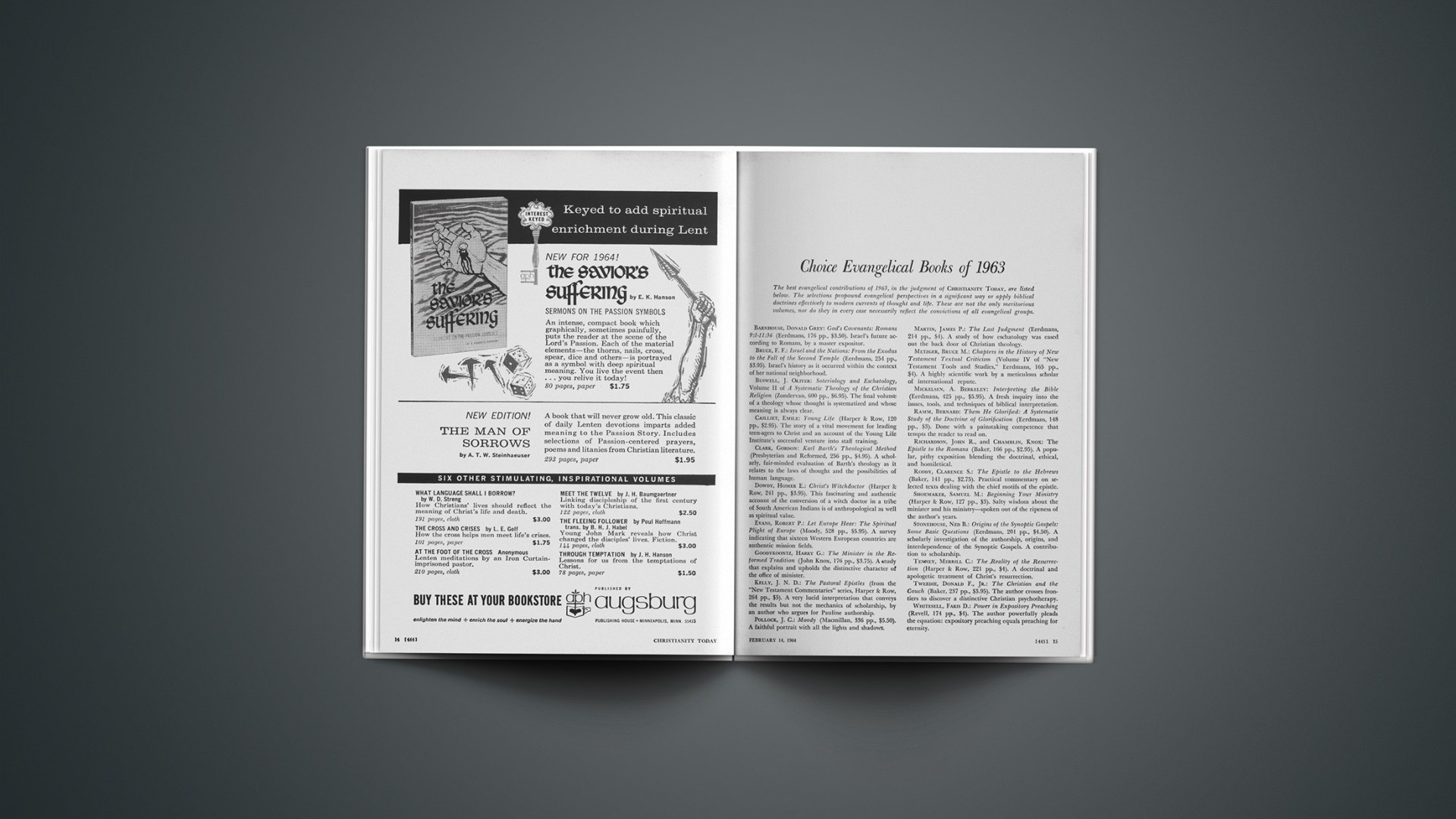 The best evangelical contributions of 1963, in the judgment ofCHRISTIANITY TODAY, are listed below. The selections propound evangelical perspectives in a significant way or apply biblical doctrines effectively to modern currents of thought and life. These are not the only meritorious volumes, nor do they in every case necessarily reflect the convictions of all evangelical groups.