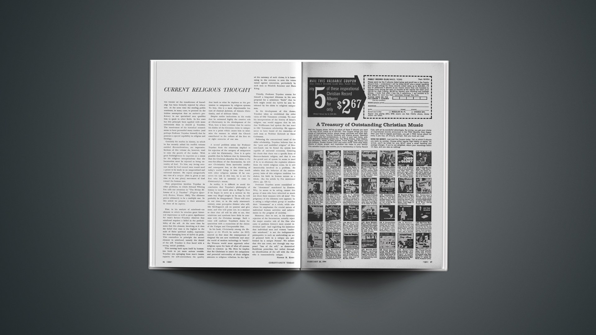 The theory of the transference of knowledge has been formally rejected by educators. At the same time the reading public continues, in many cases, to proceed on the hidden assumption that an author’s proficiency in one specialized area qualifies him to speak in other fields. In few cases has this principle been applied with more enthusiasm than to Arnold J. Toynbee. The massiveness of his historical research seems to have persuaded many readers (and perhaps Professor Toynbee himself) that he possesses a special capability in religion and theology.