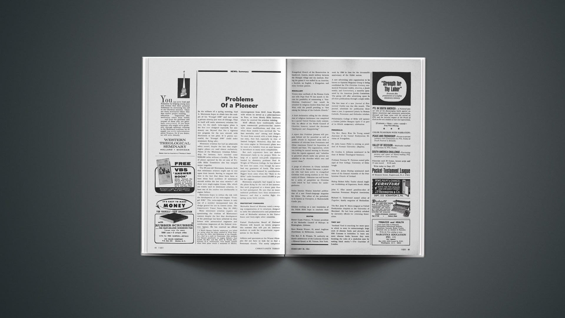 Mortenson hopes to reduce the risk with the development of his twin-engine “Evangel 4500.” The twin-engine feature is only one of a number incorporated into the design geared for use in remote areas. (See CHRISTIANITY TODAY News, May 10, 1963.)