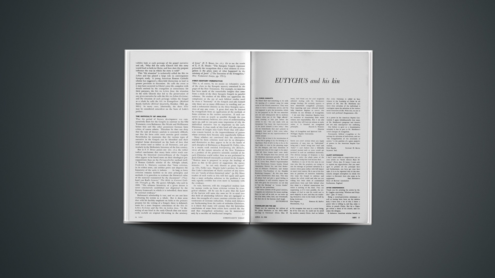 Which brings the problem into focus. If the NCC and WCC cannot command our confidence, how is the evangelical wing of Protestantism to survive, much less push ahead, unless it be rooted in an institution like the NAE? Or something in its place? Any cause that is to remain healthy over the long pull of the years must be anchored in an organization—such as liberal Protestantism is anchored in the NCC. Thank God for evangelical magazines, such as CHRISTIANITY TODAY. Thank God for evangelical colleges and seminaries. Thank God for evangelical movements such as the Billy Graham Evangelistic Association. But programs cannot flow from editorial staffs or schools or evangelists. Programs flow from organizations, which is why the NAE—or something in its place—is sorely needed.