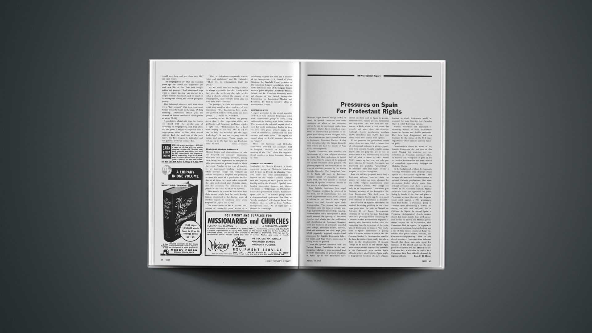 In the background of these developments touching Protestants some observers detect aspects of a church-state tug-of-war. There are signs of a new anti-Protestant crusade in regional Catholic publications. But some government leaders clearly resent hierarchical pressures and show a growing interest in the Protestant situation. Madrid authorities have just approved the public listing by hotels of the time and place of Protestant services. Recently the Supreme Court ruled against a 1961 government edict that barred a Protestant group in Valencia from establishing a church, declaring that edict null and void. Yet in Chiclana de Sigura, in central Spain, a Protestant (independent) church remains closed. For many months local civil authorities refused to answer the Madrid government’s request for an explanation, after Protestants filed an appeal. In response to government insistence, local authorities sent a list of fifty names—mostly of local reprobates with police records, socialists, and Communists—representing these as the church members. Protestants then informed Madrid that there were only twenty-five members of the church and that the civil guard had falsified the list. Madrid authorities now face a situation in which local Protestants have been officially defamed by regional officials.