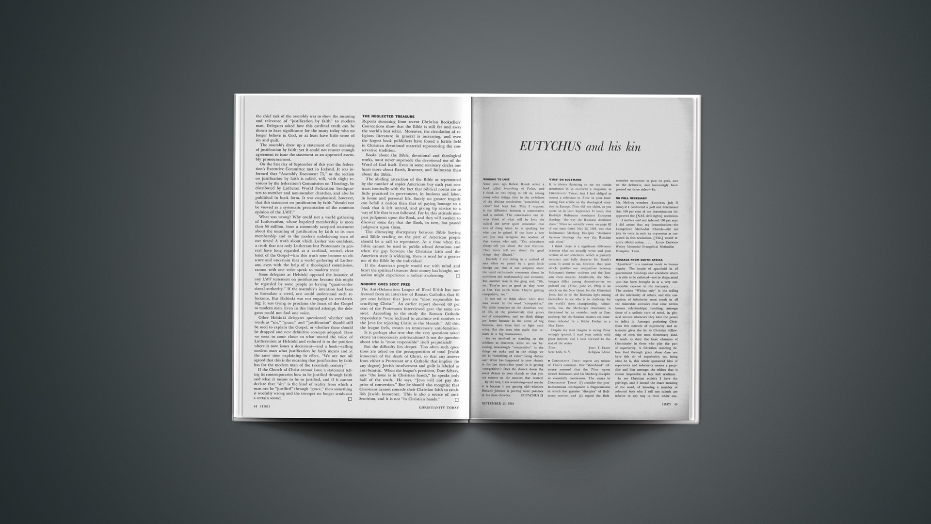 It is always flattering to see my stories mentioned in so excellent a magazine as CHRISTIANITY TODAY, but I feel obliged to correct a reference to Time in your fascinating first article on the theological situation in Europe. Time did not claim, as you quote us in your September 11 issue, that Rudolph Bultmann dominates European theology “the way the Russians dominate chess.” What we actually wrote, on page 62 of our issue dated May 22, 1964, was that Bultmann’s Marburg Disciples “dominate German theology the way the Russians rule chess.”