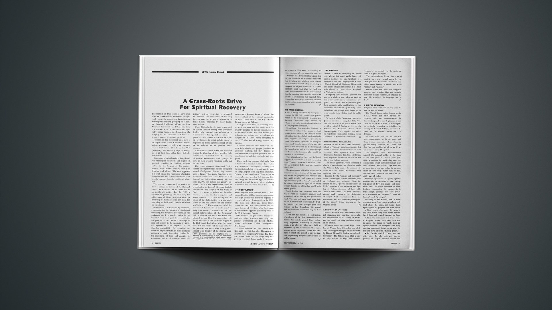 The summer of 1964 seems to have given birth to a rank-and-file movement for spiritual recovery in mainstream Protestantism. New organizations are springing up to combat theological dilution within the large American denominations. Behind the drive is a renewed spirit of determination, especially among laymen, to demonstrate the integrity of the Scriptures and their supreme relevance to modern problems.